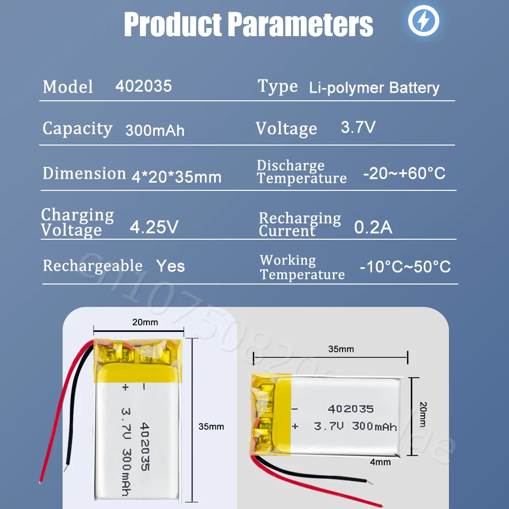1-2 шт. 3,7 В 300 мАч 402035 042035 перезаряжаемый литий-полимерный аккумулятор для часов рекордер светодиодный свет MP4 Bluetooth-гарнитура динамик