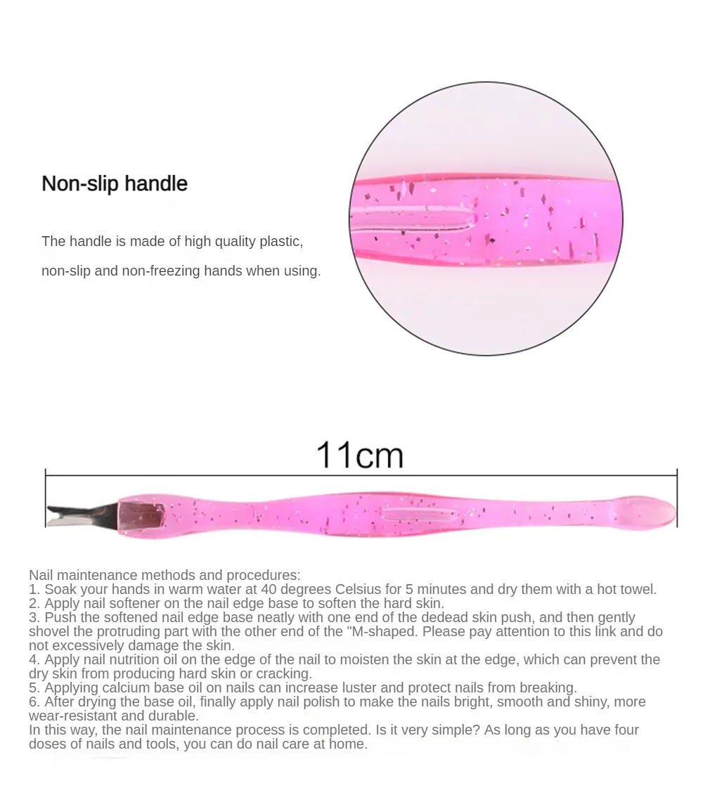 3.V-образная конструкция вилки хорошо подходит для проталкивания и очистки омертвевшей кожи, которую трудно удалить с ногтя, удобная пластиковая ручка упрощает и удобна очистка ногтей, толкатель для кутикулы ногтей легко помогает придать кутикуле форму, подходит для салона или домашнего использования.