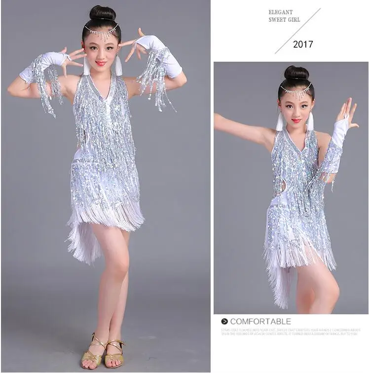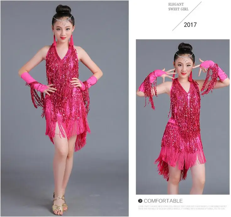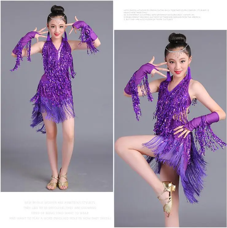 1 компл./лот, детское модное платье с блестками для латинских танцев, платье с v-образным вырезом и кисточками для девочек, 4 цвета