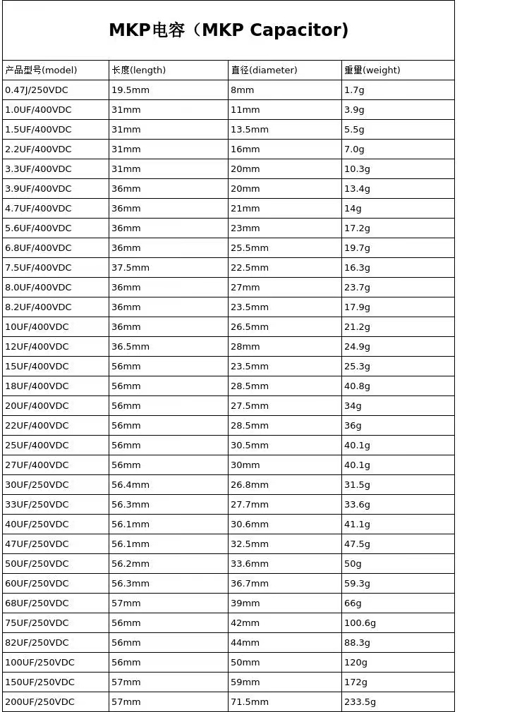 0.47J/250V, 1,0 UF/400V, 1,5 UF/400V, 2,2 UF/400V,