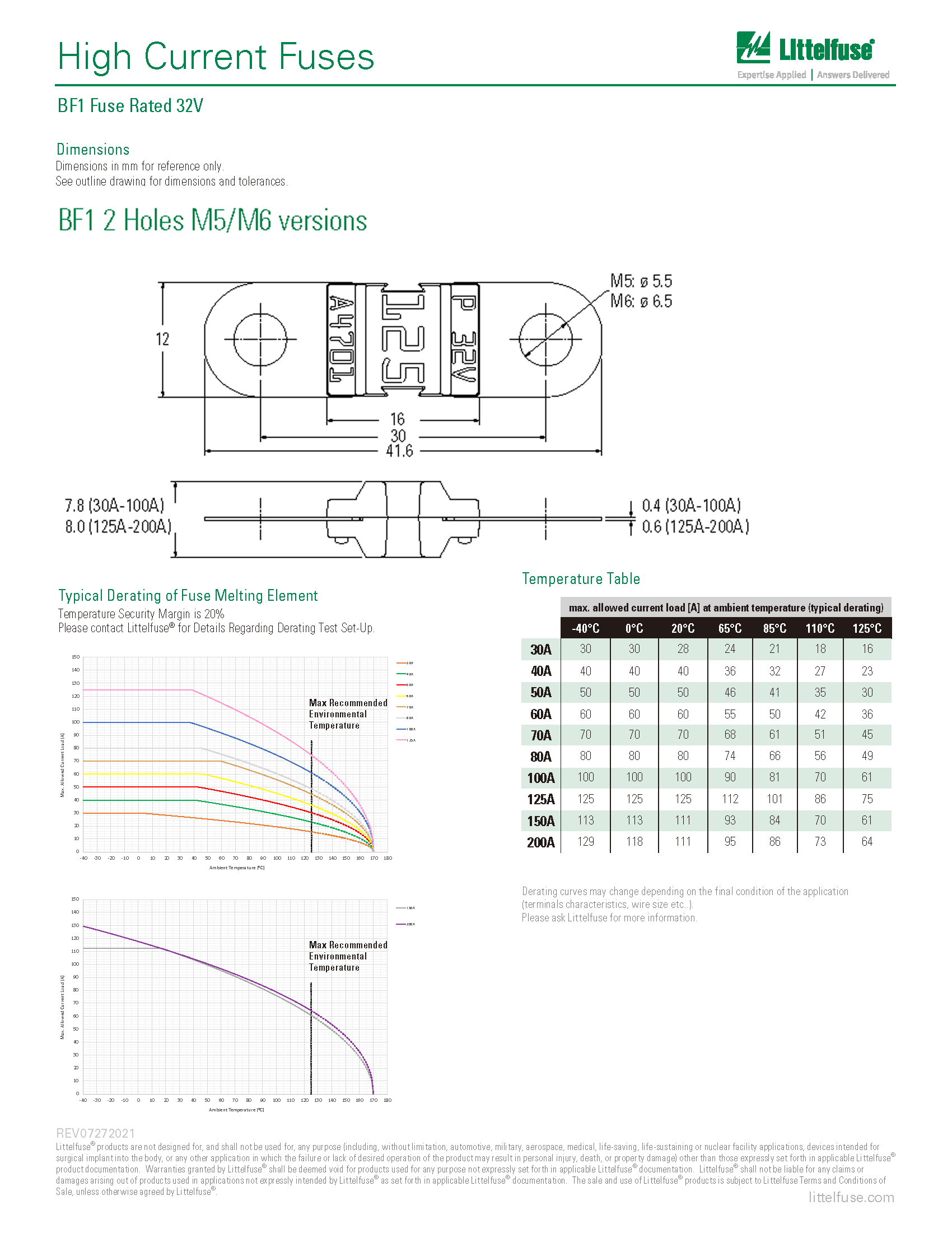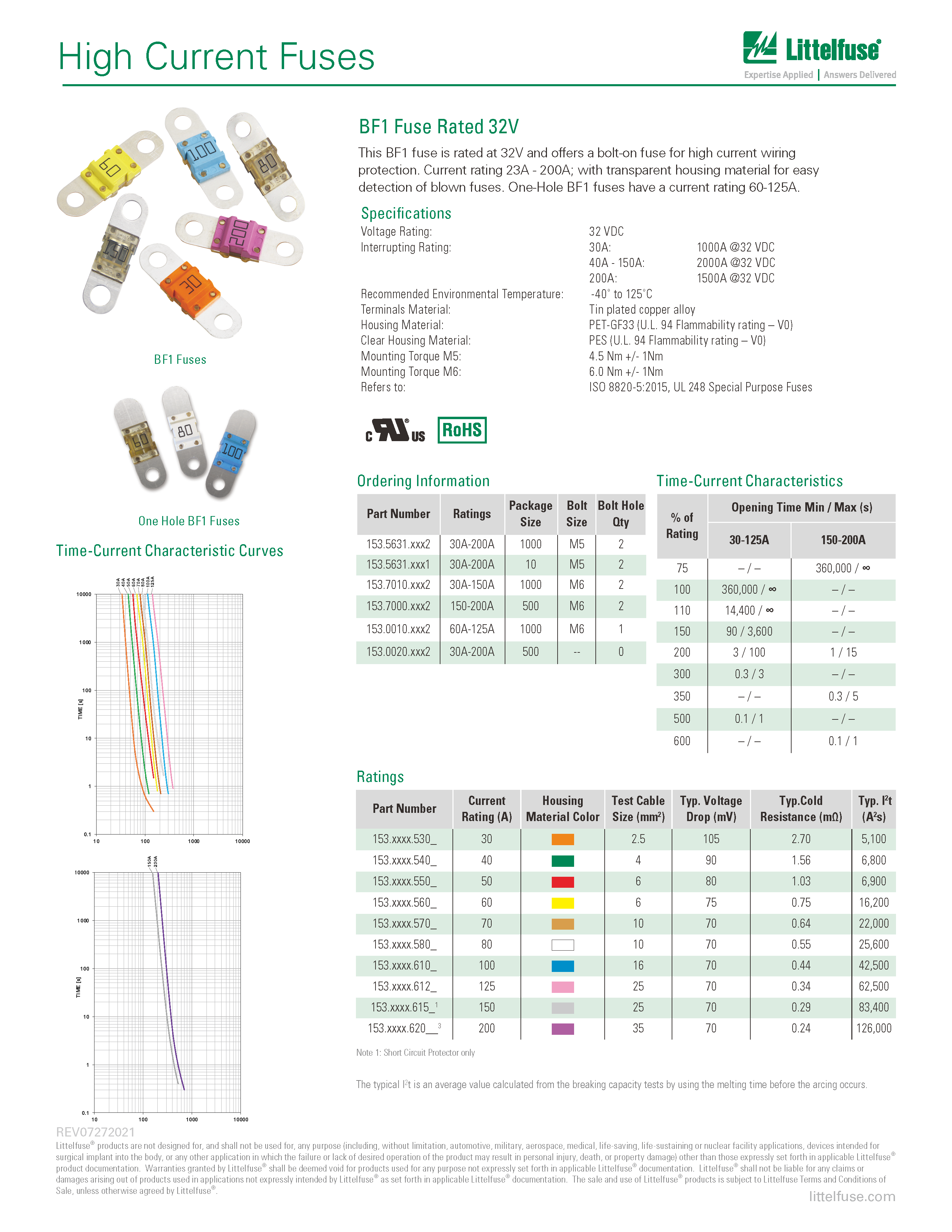 1 шт. автомобильный предохранитель, серия BF1, автоматический предохранитель 30 А, 40 А, 50 А, 60 А, 80 А, 100 А, 125 А, 150 А, 200 А, плавкий предохранитель с номинальным напряжением 32 В, LITTELFUSE