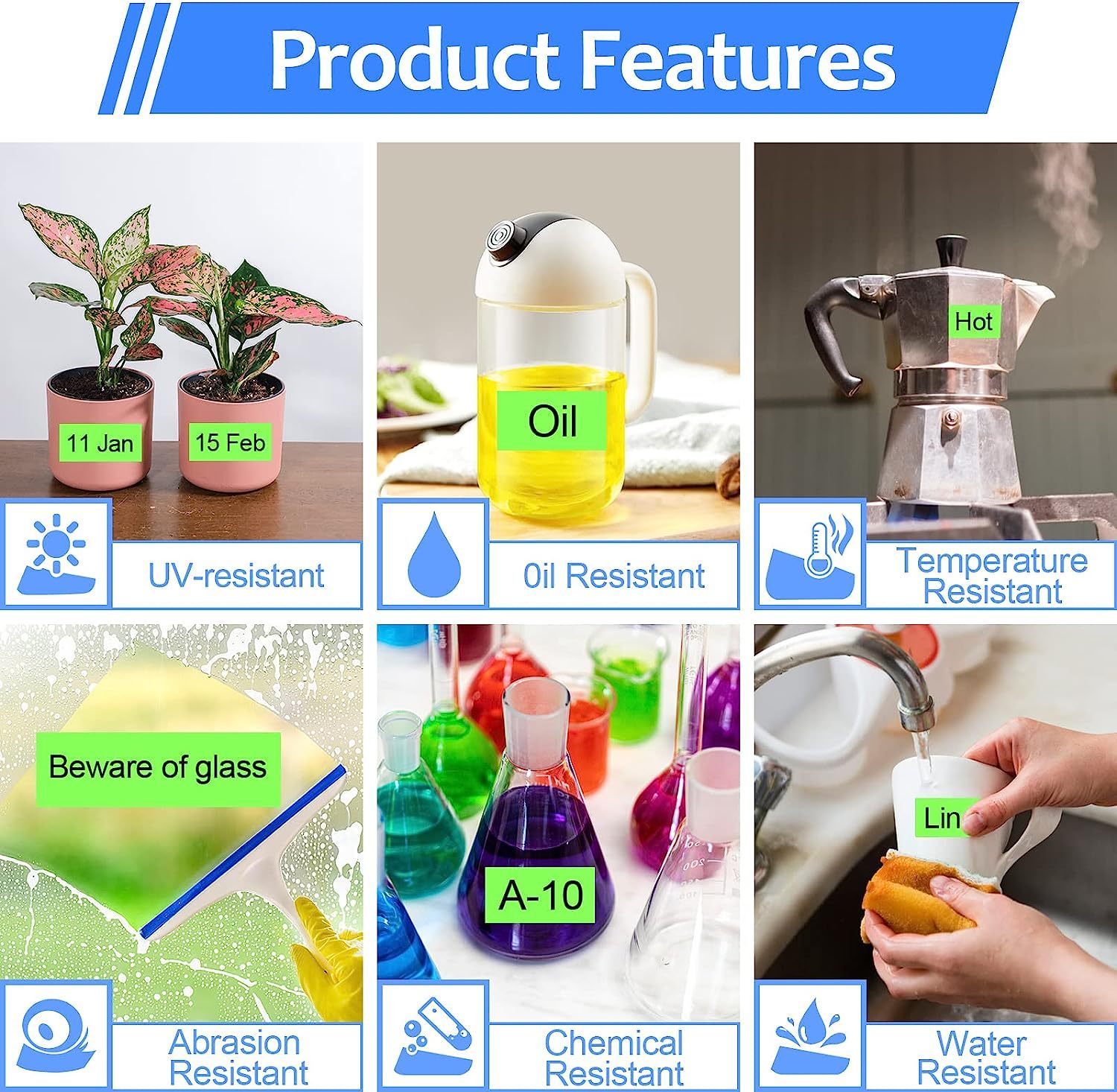 3. Домашнее или Промышленное использование: его можно использовать для дома, бизнеса или промышленного применения. Он идеально подходит для маркировки кухонных, стеллажей и шкафов, а также может использоваться в морозильных камерах, микроволновых печах и посудомоечных машинах. Он не потускнеет и не размазывается.