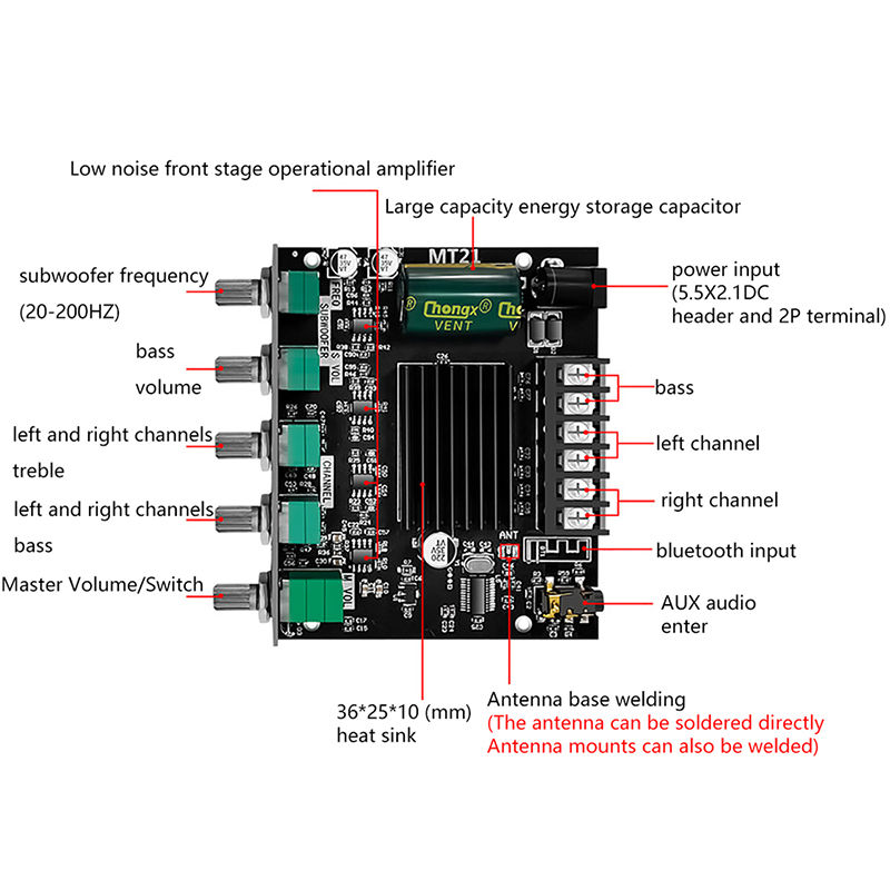 Он имеет два режима аудиовхода, совместимых с AUX и Bluetooth, и плату усилителя мощности «Два в одном», совместимую с 5,0, с более высокой эффективностью передачи и большим расстоянием.