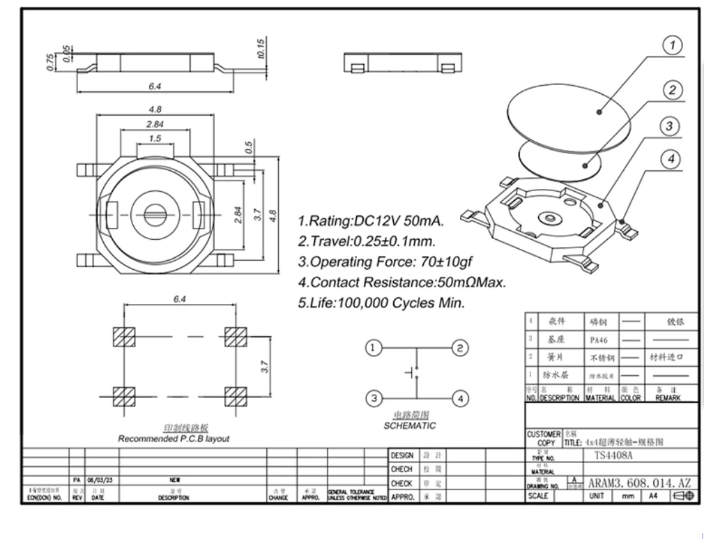 100 шт./лот мембранный переключатель 4x4x0,8 мм 4x4x0,8 мм Тактильный кнопочный переключатель 4-контактный 4*4 * мм микропереключатель SMD