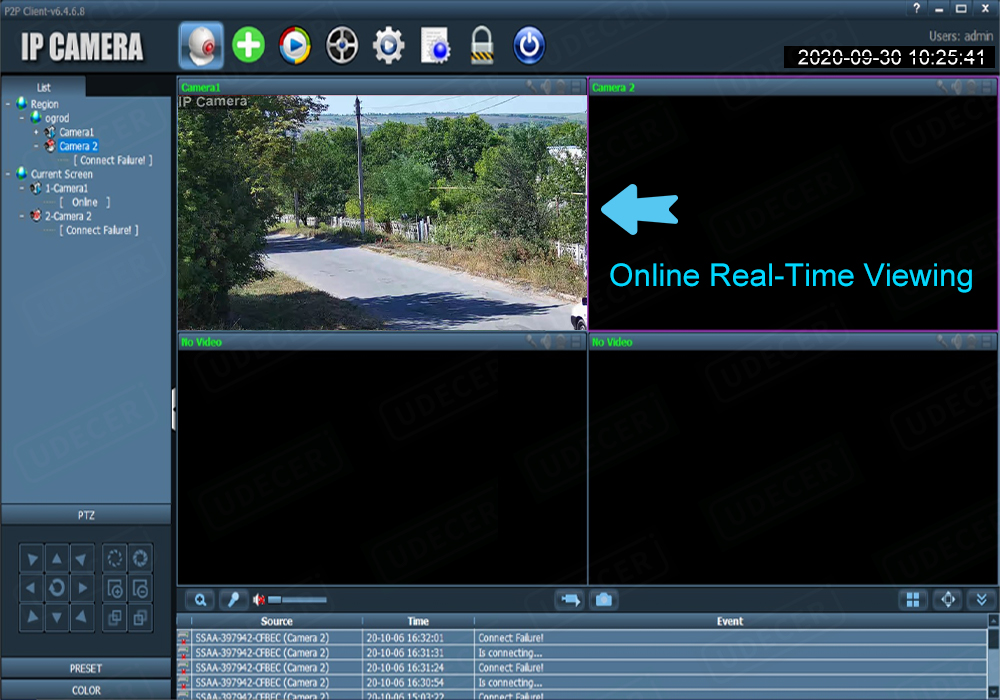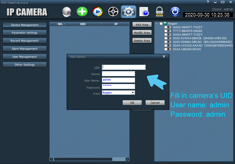 2. Введите UID камеры. Имя пользователя: admin, Пароль: Admin