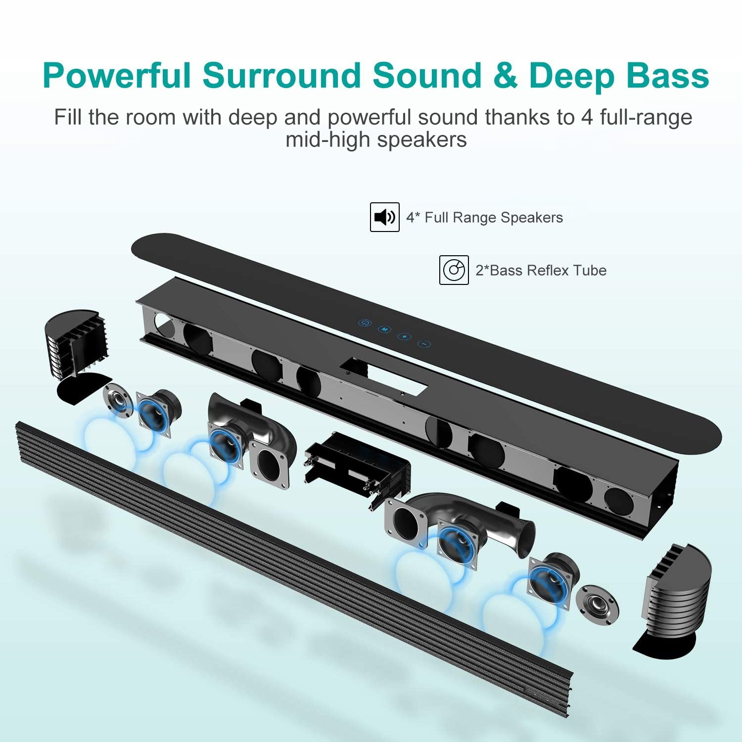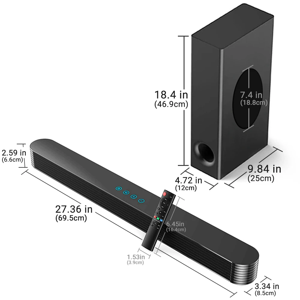 >2.1 channel system: 80w sound bar comes with a 40w wired subwoofer, bring rich deep bass, powerful 120W, output 105dB, the crystal-clear sound fills the entire room, make you immersed in the world of music.