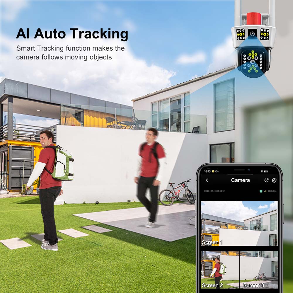 * Благодаря передовой технологии автоматического отслеживания AI, после блокировки цели видеокамера автоматически регулирует вращение панорамирования/наклона, отслеживая движущиеся объекты, автомобили, домашних животных, человека. Эта камера видеонаблюдения никогда не позволит вам пропустить ни одного важного момента.