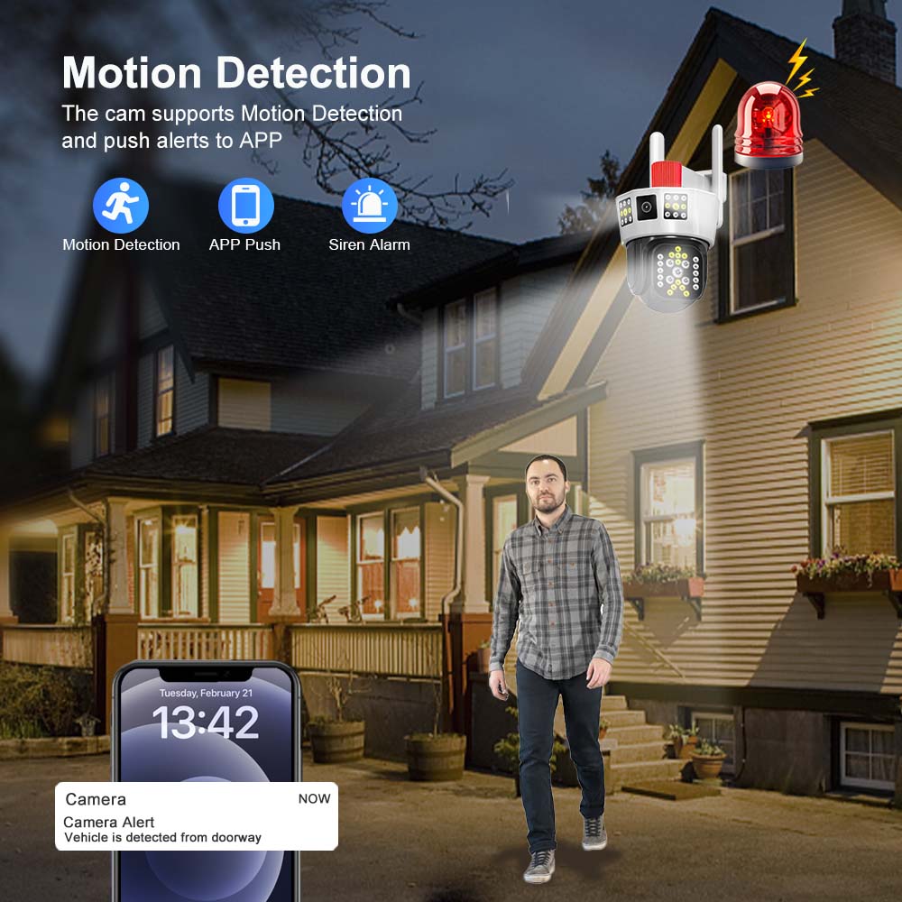 * Эта камера безопасности имеет интеллектуальную функцию обнаружения AI, поддерживает автоматическое отслеживание гуманоидов AI и сигнализацию обнаружения гуманоидов AI, может точно обнаруживать движения и отправлять вам уведомления через приложение. Автоматическое отслеживание
