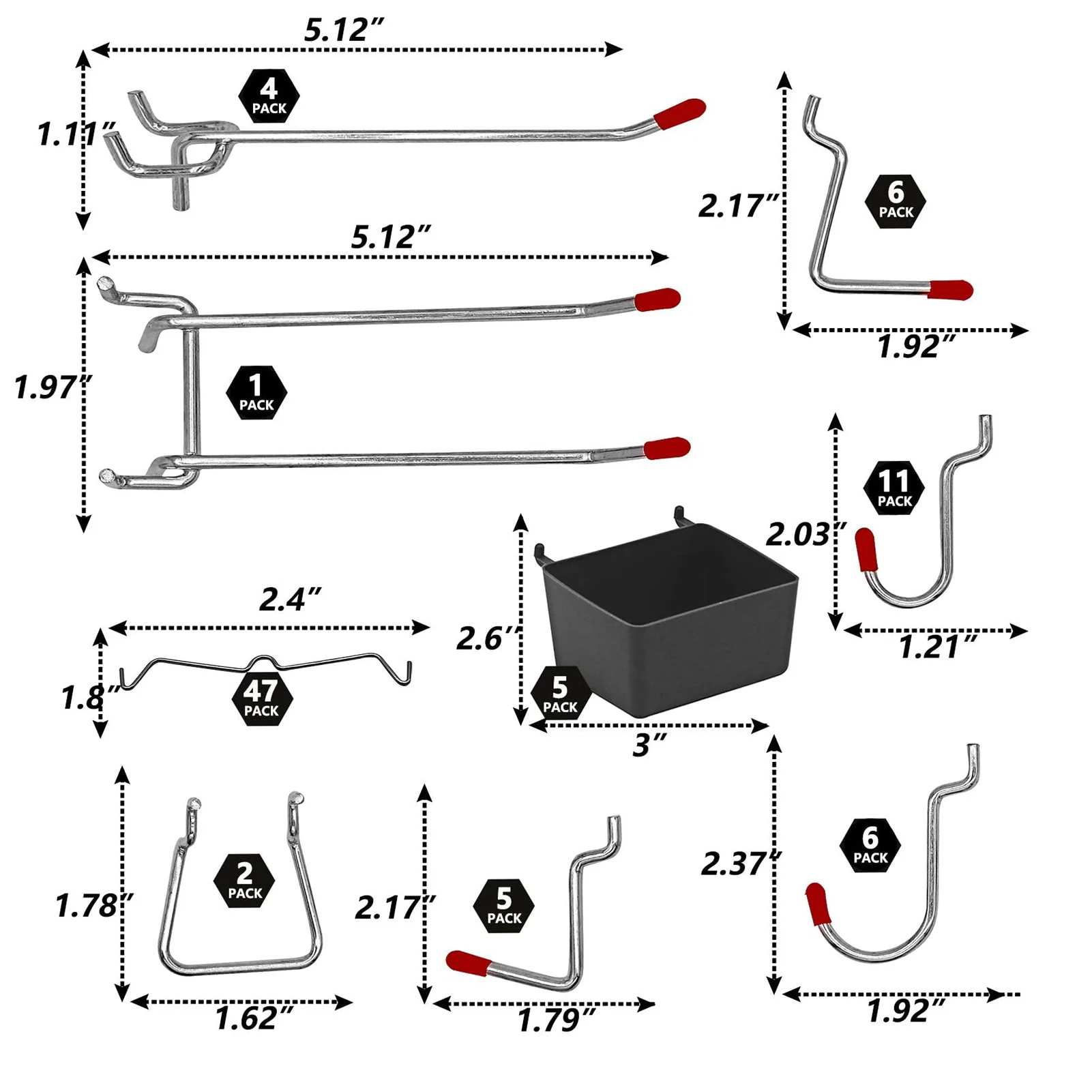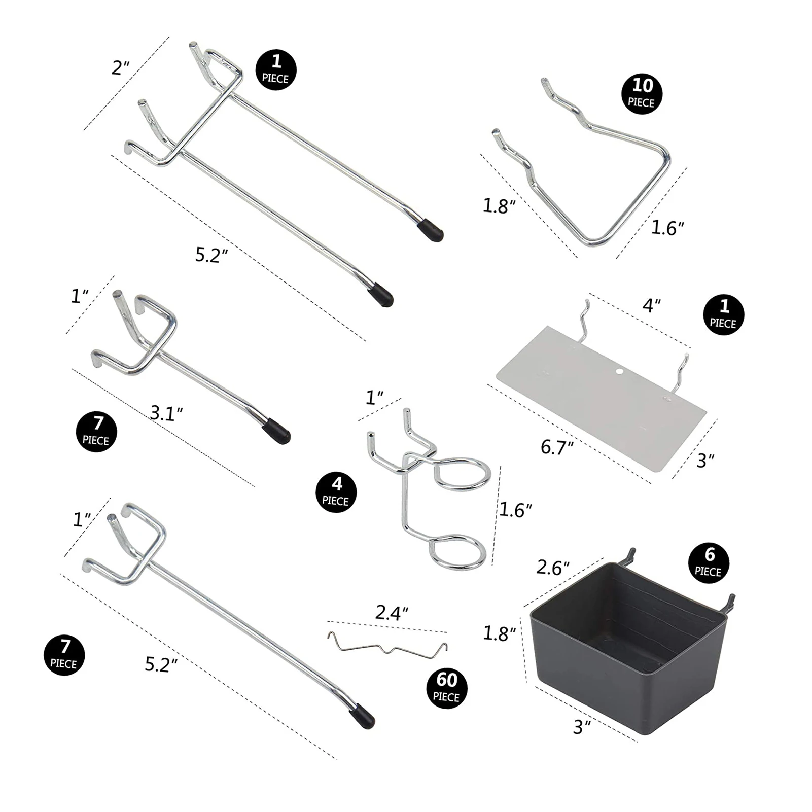 Включает в себя 15 различных типов крючков и органайзеров, прямые крюки, изогнутые крючки, угловые крючки, многофункциональные стойки для инструментов, И pegboard бункеры плюс 60 шт колышек замки все вместе как 140 шт pegboard Крючки ассортимент, является полностью функциональным для широкого диапазона висячих применений.
