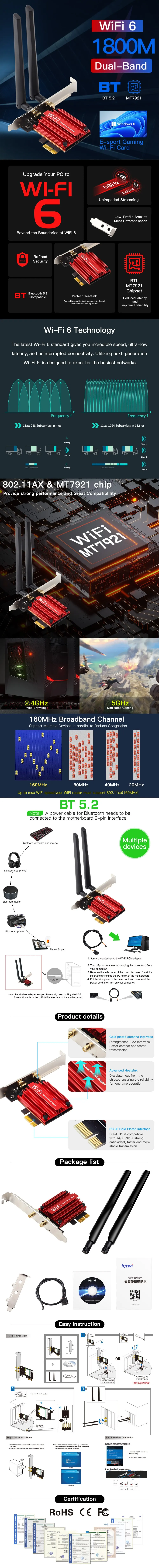 1800 Мбит/с Wifi 6 PCI Express беспроводной адаптер Bluetooth 5,2 двухдиапазонный 802.11AX/AC MT7921 PCIe Wi-Fi сетевая карта Windows 10 11