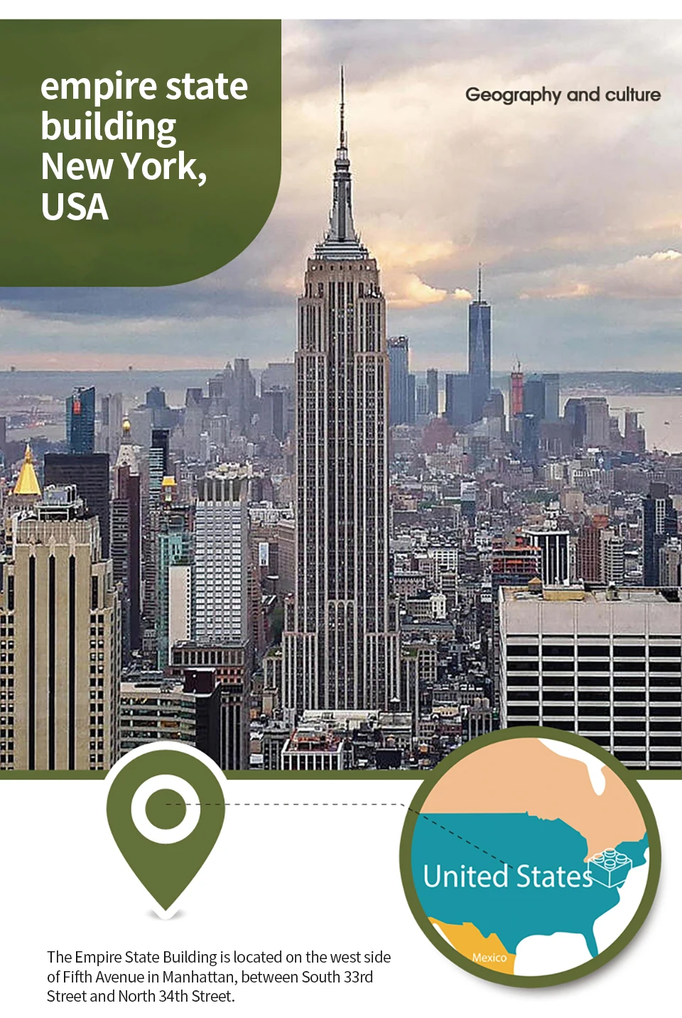 Эмпайр Стейт Билдинг, высотное здание, завершенное 11 апреля 1931 года, является одним из знаковых зданий в Нью-Йорке. Он расположен на 350 Пятой авеню, между Западной 33-й и Западной 34-й улицами в Манхэттене.