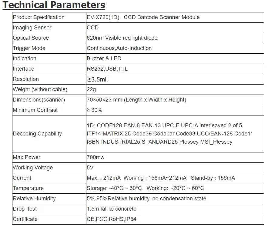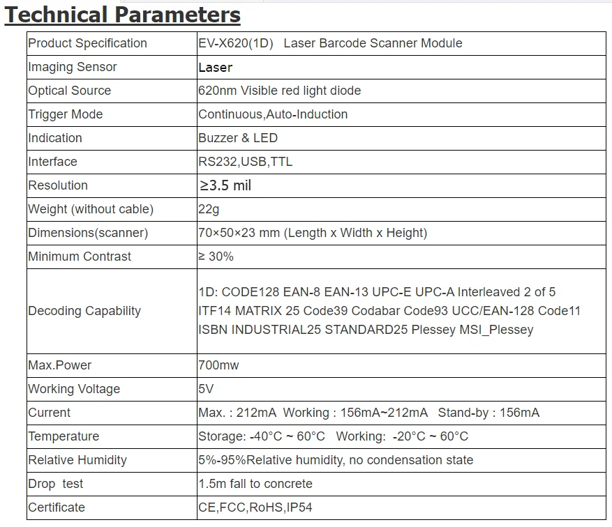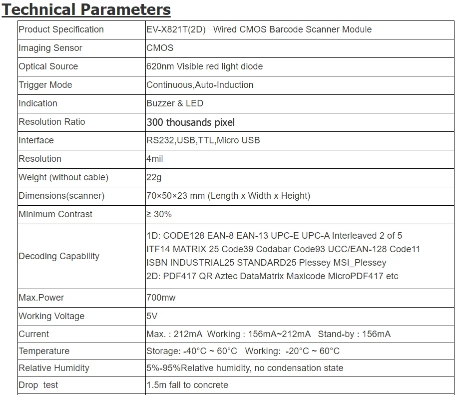 1. Без драйвера, подключи и работай. 2. Поддержка интерфейса RS232 и USB,TTL. 3. Широкоугольный объектив desian, сканирует большую площадь. 4. Супер сканирование и возможность декодирования, может читать Неполные и нечеткие коды. 5. Мини-размер и легкий вес легко интегрируются в различные решения, такие как киоски, линии потока, медицинское оборудование, билетные автоматы, КПК, торговые автоматы и многое другое. 6. Может быть настроен в соответствии с требованиями заказчика