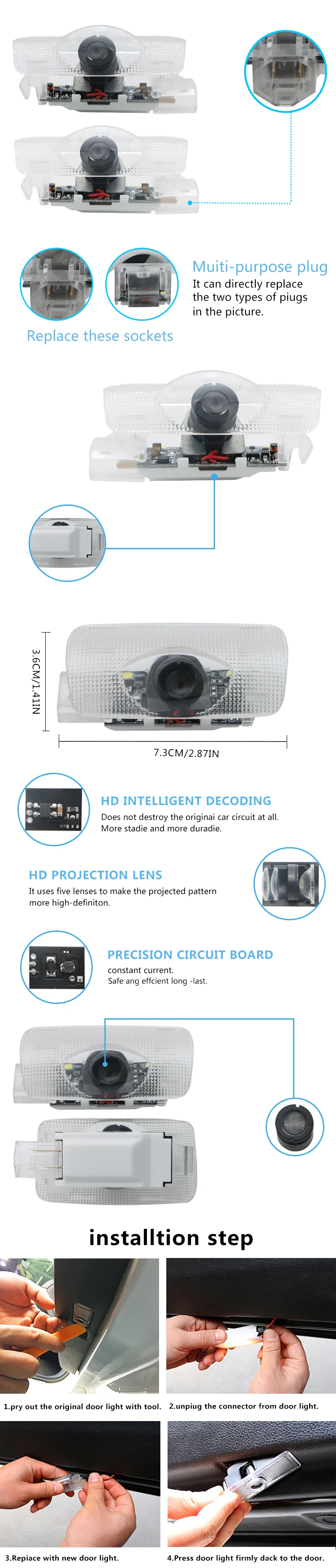 Легко установить: непосредственно заменить оригинальную дверную светильник, нет необходимости сверлить отверстие, без проводов.