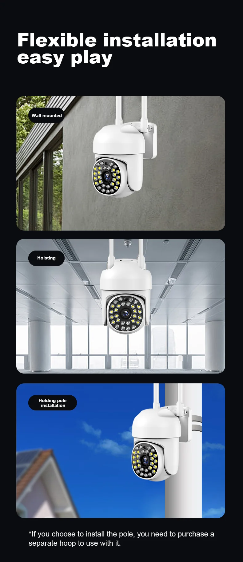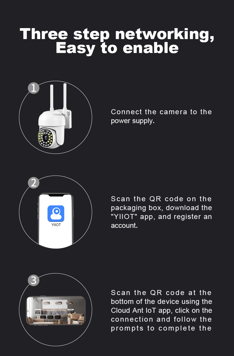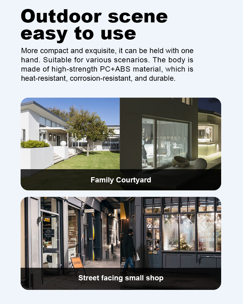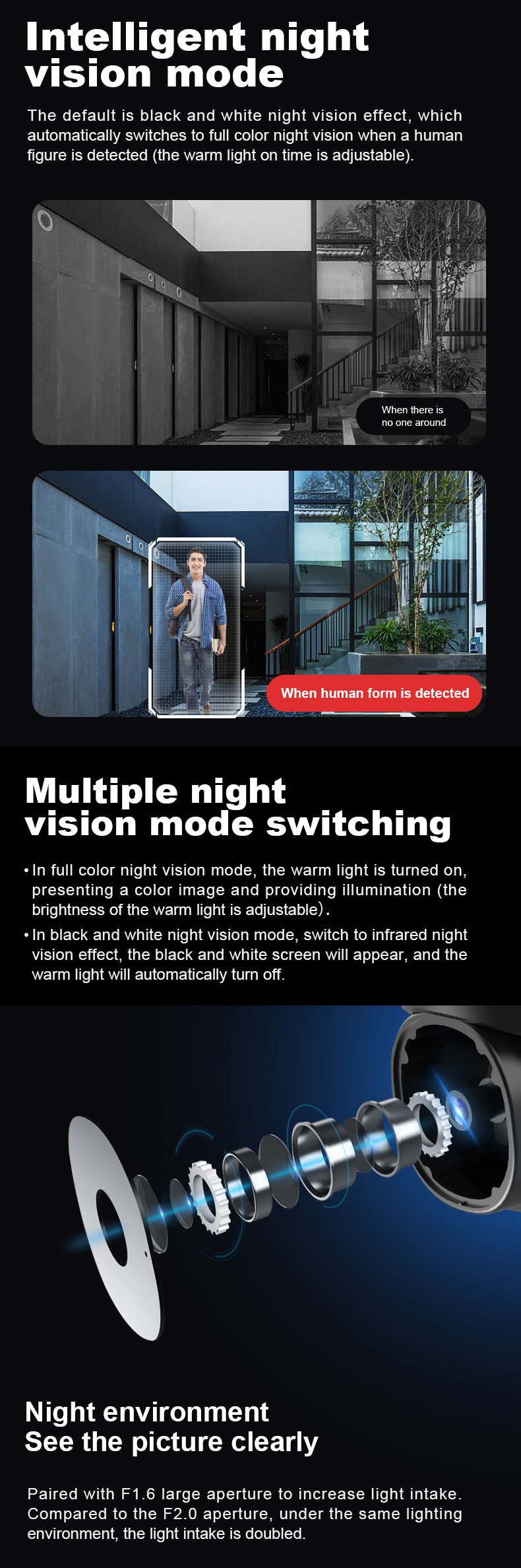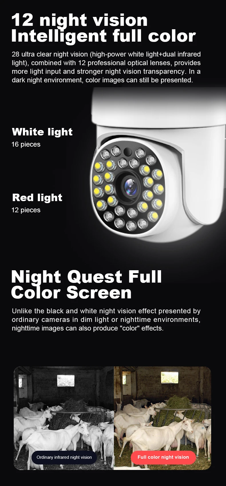 Когда все огни выключены, функция ночного видения включается автоматически и нормально работает ночью. Когда он обнаруживает, что кто-то приближается, он издает сильный белый свет или звуковой сигнал, чтобы уехать. (Необходимо установить в настройках)