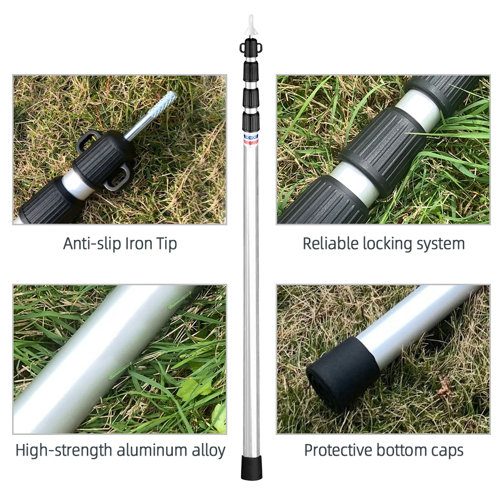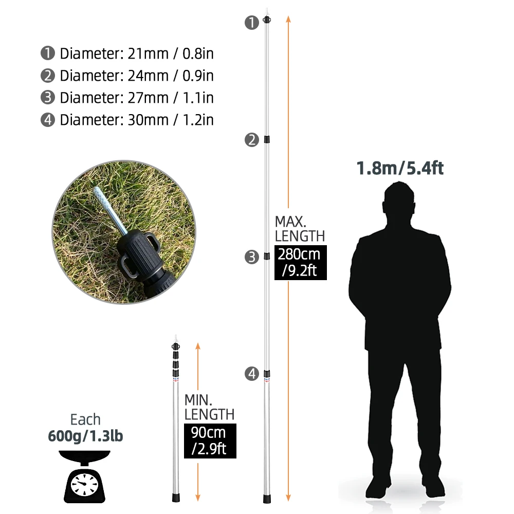 4 секции дизайн с удобной регулировкой от 0,9 m (2.9ft) до 2,8 м (9.2ft) для того, чтобы соответствовать различным палатки.