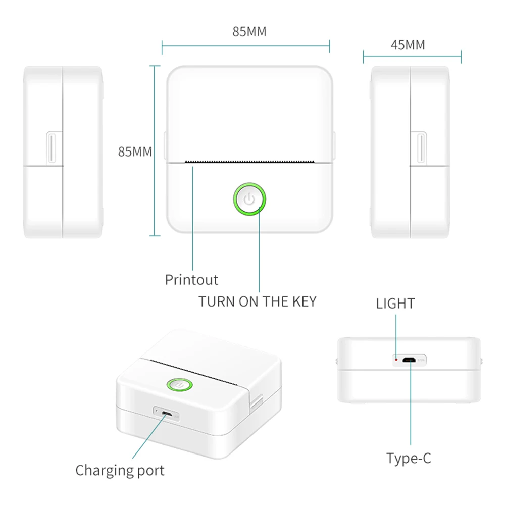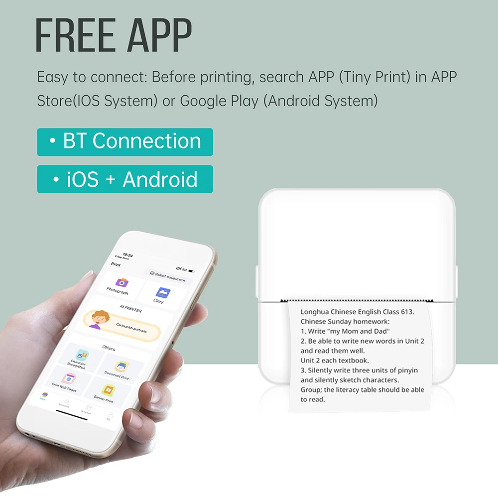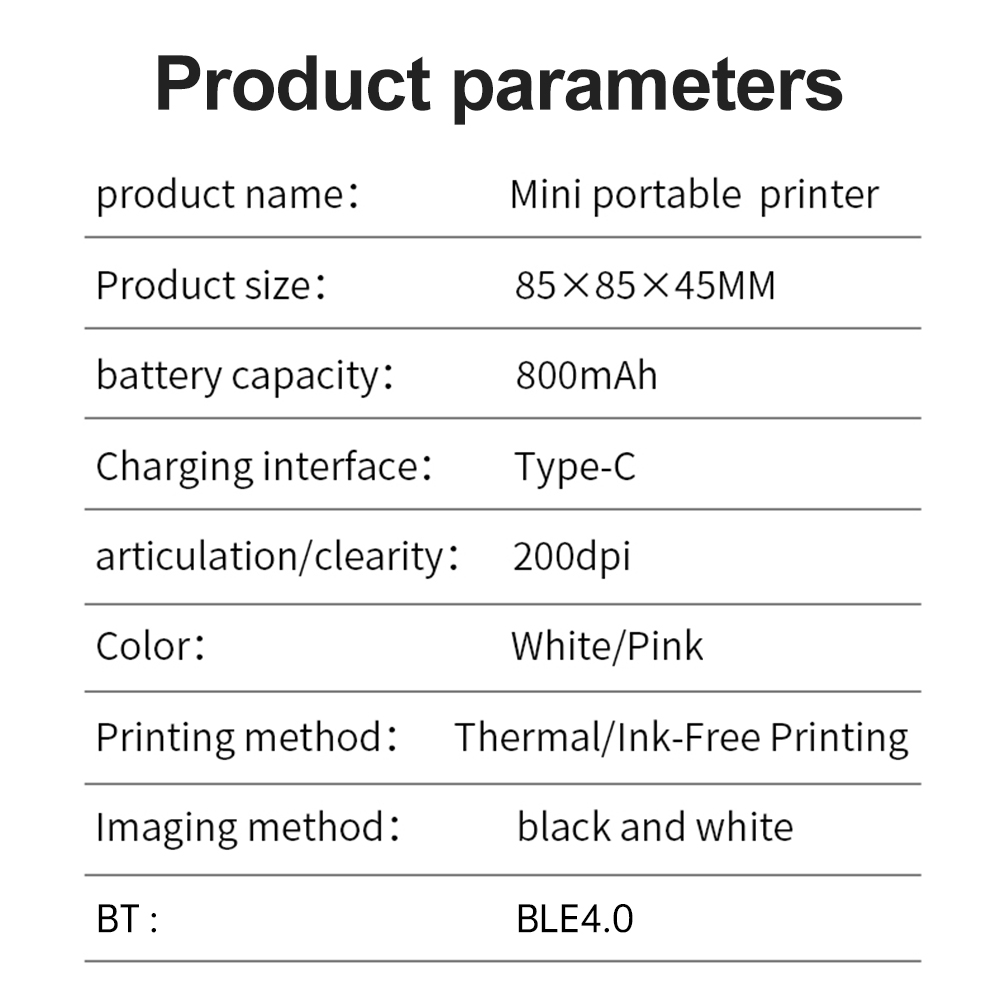 ✔Способ подключения: этот принтер поддерживает беспроводную связь BT 4,0, что позволяет легко подключаться к вашему смартфону. Чтобы использовать его, просто следуйте руководству пользователя, чтобы загрузить соответствующее приложение (Tiny Print) из App Store (для систем IOS) или Google Play (для систем Android).