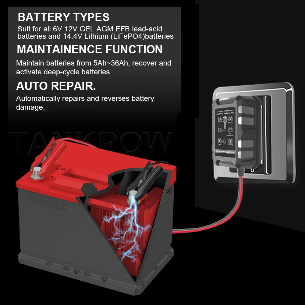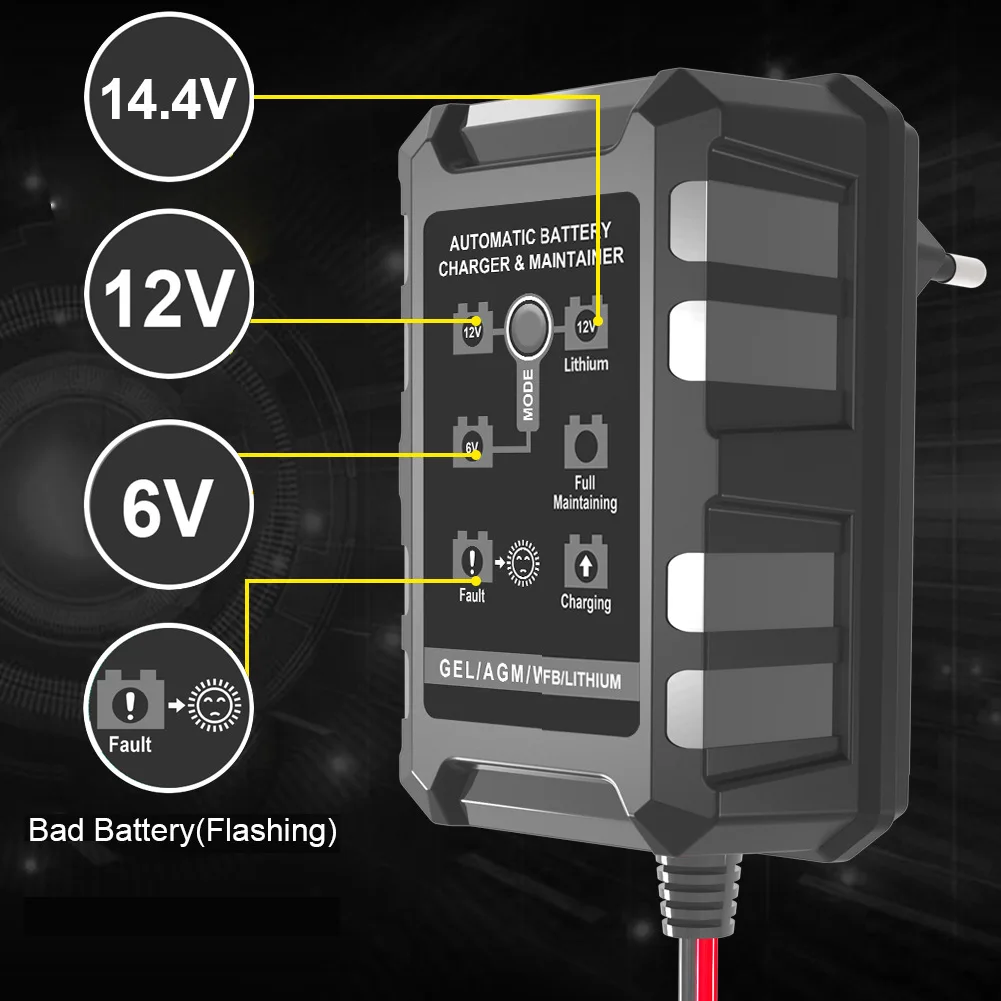 4. Подходит для детей в возрасте от 6V/12V свинцово-кислотный объект соглашения о качестве предоставляемых услуг, гель лак для ногтей, AGM, батарея для зарядки или 14В LiFePO4 зарядки аккумулятора. Техническое обслуживание автомобилей, автомобилей, мотоциклов, лодок, тракторов, грузовиков, квадроциклов, внедорожников, внедорожников.