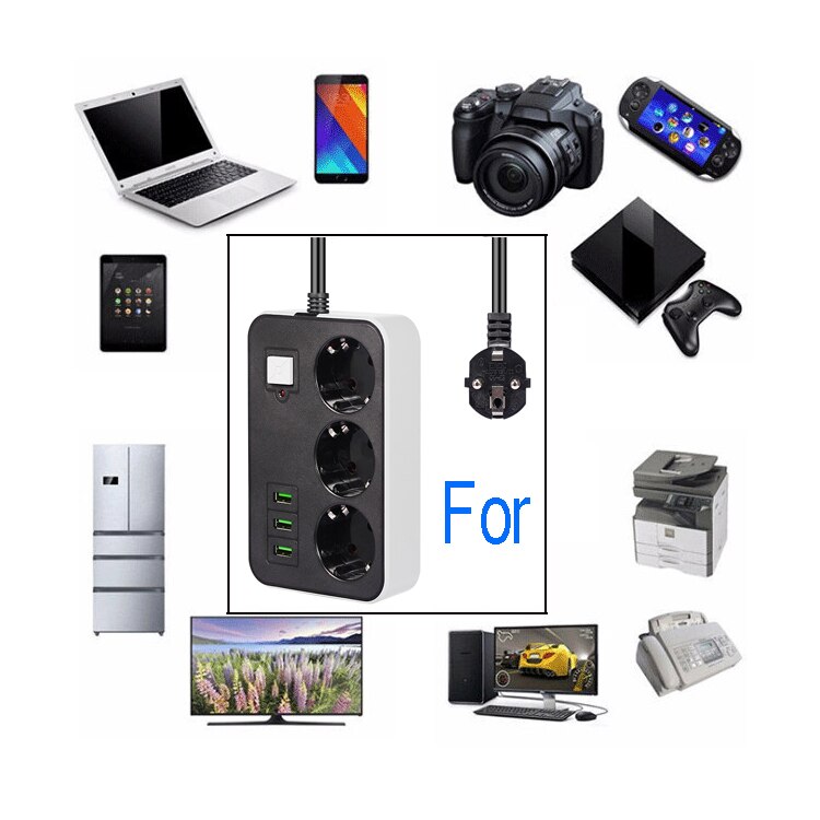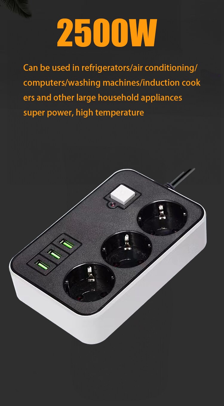 • 3 розетки и 3 порта USB:Заряжайте несколько устройств одновременно с помощью 3 розеток и 3 портов USB.