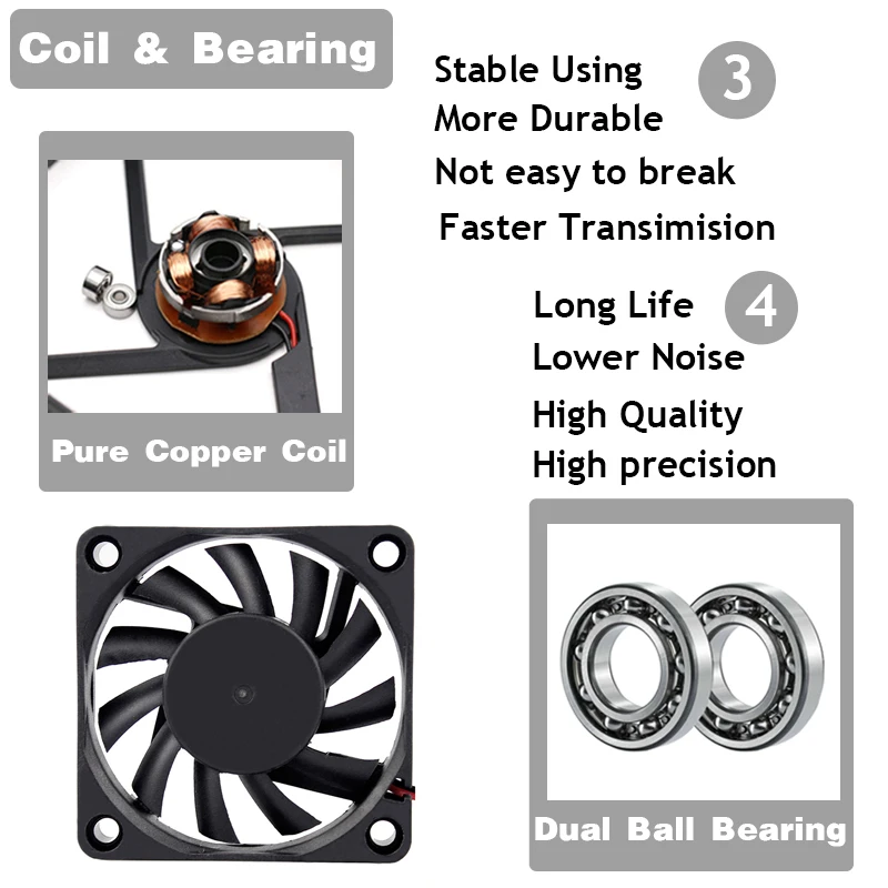 2. По сравнению с другими подшипниками вентиляторы с двойными шарикоподшипниками издают немного больше шума, но служат дольше.