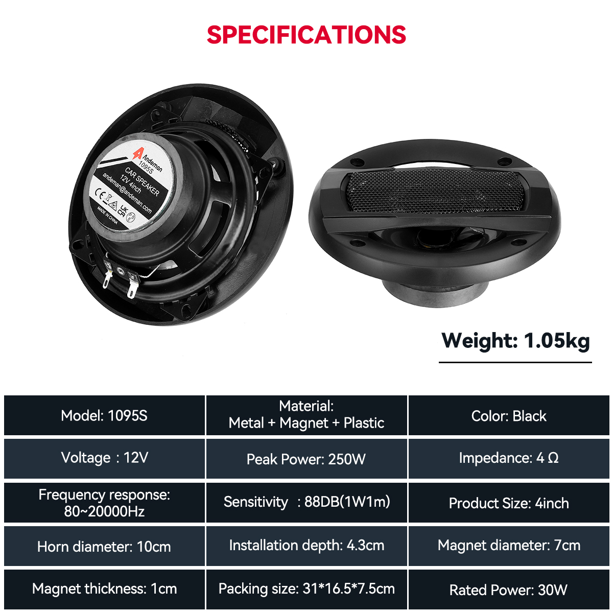 2 шт., автомобильный коаксиальный динамик, 4 дюйма, 12 В, 30-250 Вт
