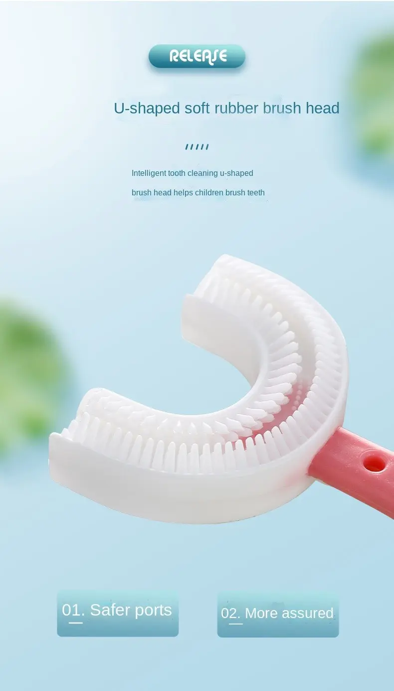 【Очистка на 360 ° 】 U-образная головка эффективно удаляет 99% остатков во рту. Наши зубные щетки обеспечивают чистку полости рта вашего ребенка на 360 градусов.