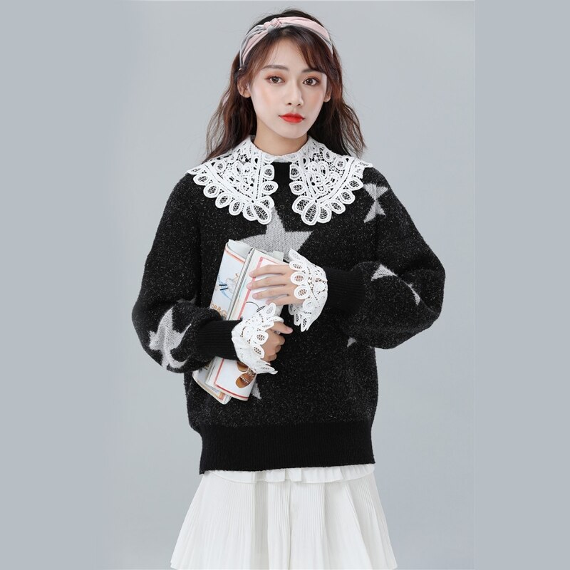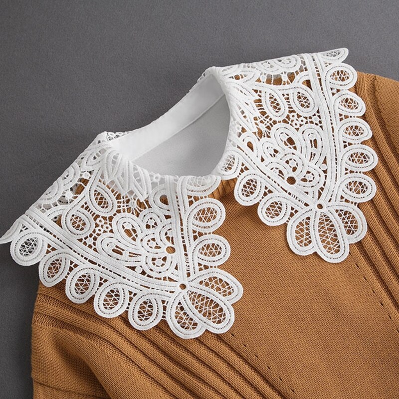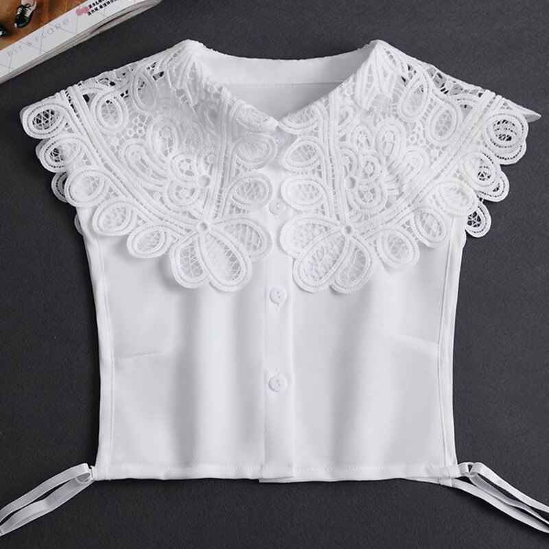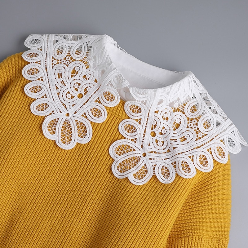 Воротник: большой воротник с лацканами, застежка на пуговицы, полое кружево.