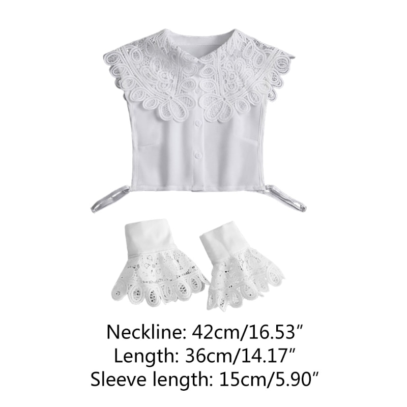 Манжеты: расклешенные манжеты из рога, кружевной дизайн, однотонный белый цвет, закрываются на 4 пуговицы.