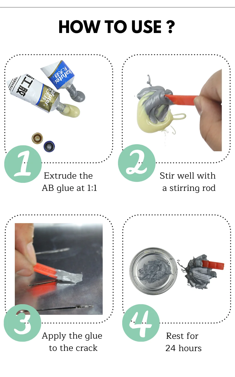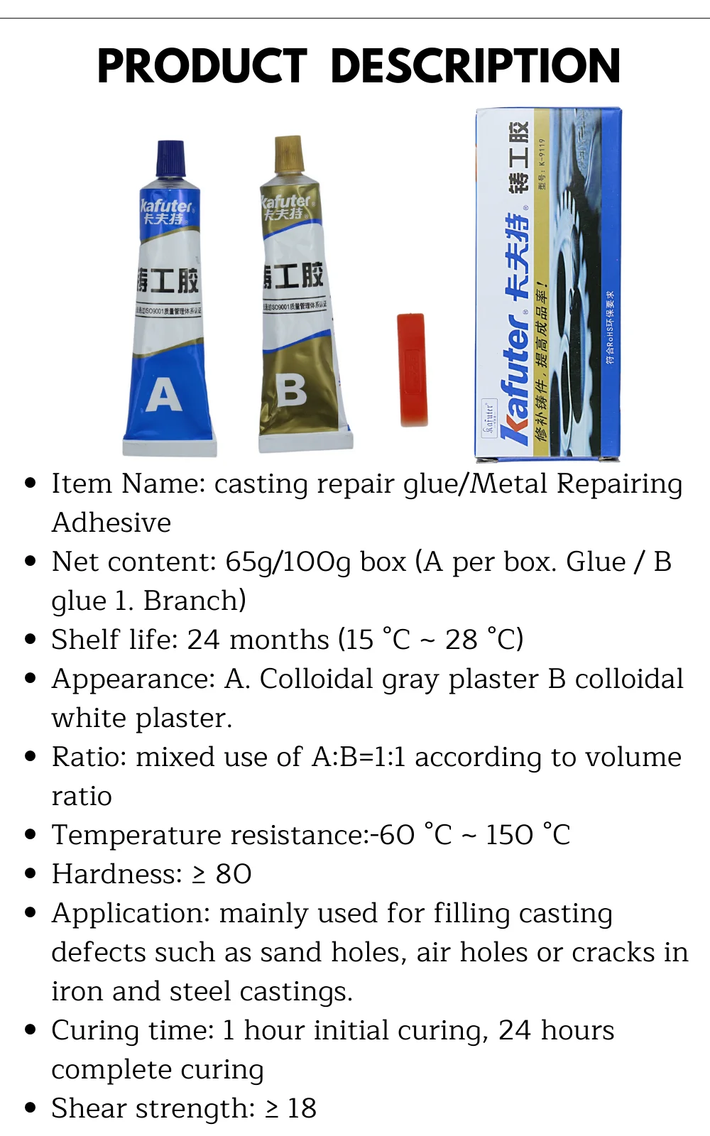 • Основные применения: используется для ремонта литья металла. Он изготовлен из эпоксидной смолы, отверждающего агента, упрочняющего агента,