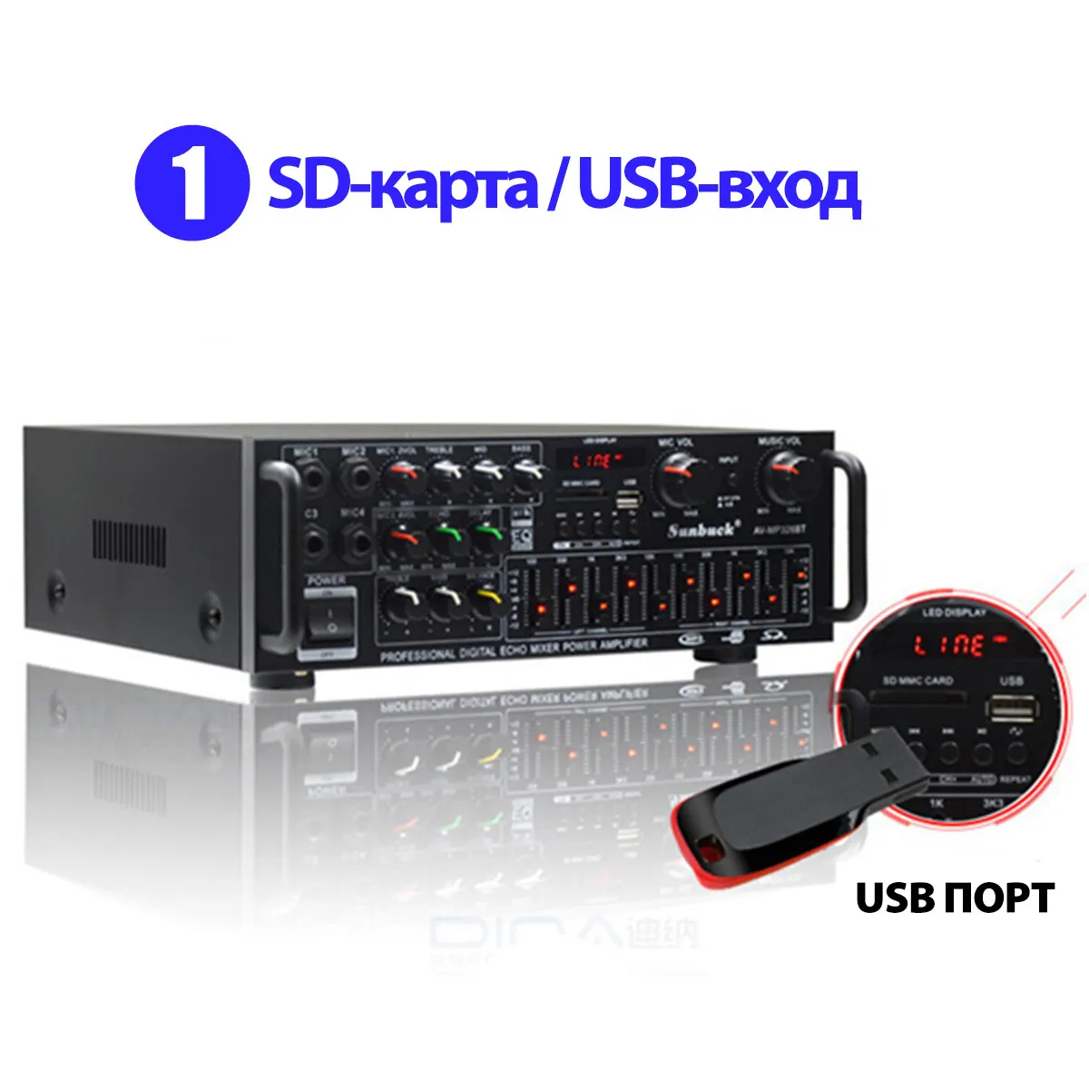 -Реверберация, тонкая настройка, баланс, SD, USB интерфейс.