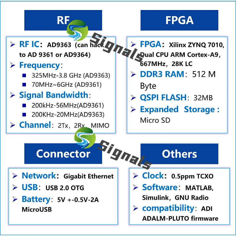 PLUTO +-это программно-определяемая радиоплатформа, которая поддерживает 2TX и 2RX, поддерживает Gigabit Ethernet и Micro SD-карту. Это относится к дизайну для известных ADALM-PLUTO ADI и улучшает его недостатки.