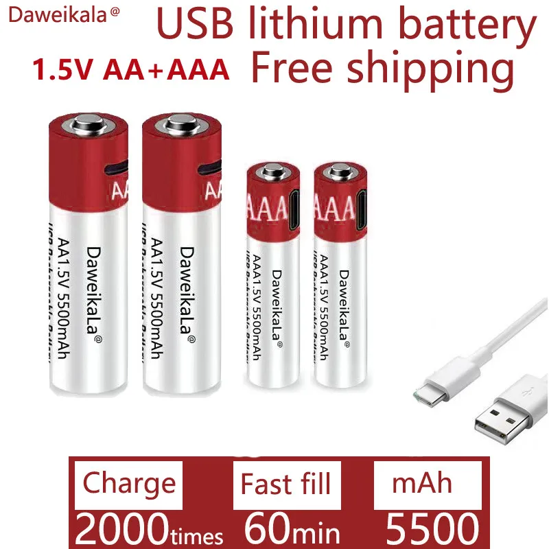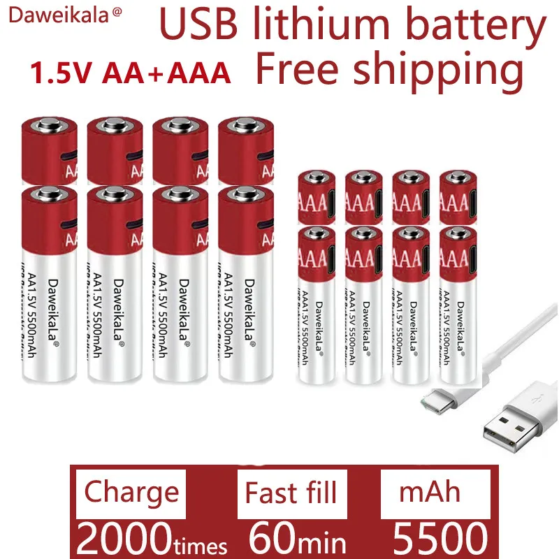 100% новый AA 1,5 В 5500 мАч/1,5 В AAA 5500 мАч перезаряжаемый Новый USB литий-ионный аккумулятор фонарик игрушечные часы MP3-плеер заменить Ni MH аккумулятор Характеристики AA: Емкость: 5500 мАч AAA: Емкость: 5500 мАч 1 марка: kaweikala 2. Высокое напряжение: 1,5 В 3. Тип батареи: AAA, аккумуляторная щелочная батарея. Материалы для защиты окружающей среды 6. До 2000 циклов зарядки со сроком службы 10 лет. Отличная высокая производительность излучения/дренажа 8. Полностью заменить стандартную батарею размера AAA 9. Отличная производительность при низкой температуре 10. Больше времени на устройствах с высоким потреблением. 11 для портативной ленты дистанционного управления и телевизора, часов и радио, видеоигр, дымовых сигнализаций, беспроводных телефонов, электрических игрушек, и т. д. 2PC = 1AA + 1AAA4PC = 2AA + 2AA8PC = 4AA + 4AA16PC = 8AA + 8AAA24PC = 12AA + 12AA40PC = 20AA + 20AAA