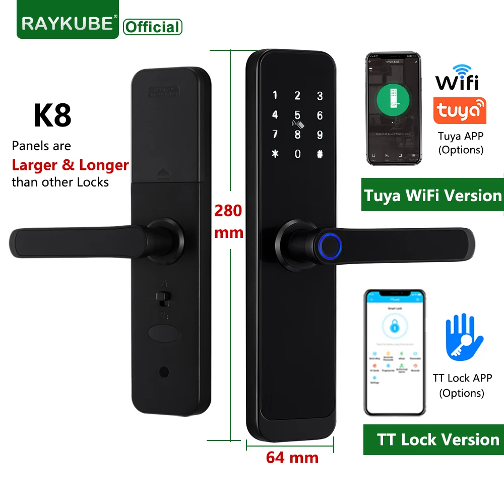 2023 НОВЫЙ RAYKUBE K8 Tuya Wifi Умный дверной замок TT Замок с отпечатками пальцев Цифровой Электрический замок с более длинной большой ручкой-Панелями