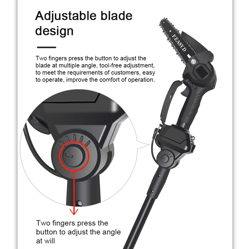 Эта обрезная бензопила, легкая и портативная, ручка соответствует инженерному дизайну человека, проста в использовании и экономит усилия. Предназначен для резки или обрезки веток в фруктовых садах, виноградниках и т. Д. Алюминиевый съемный Телескопический столб, 3 секции с регулируемой высотой, каждая секция высотой 0,55 м, каждая секция может быть индивидуально заряжена. Регулируемый угол наклона лезвия, повышает комфорт работы. Широкое применение, подходит для обрезки деревьев на большой высоте в садах, лесном хозяйстве и озеленении городов, идеально подходит для садового дизайна, обрезки цветочного рынка, обрезки ферм и т. Д.