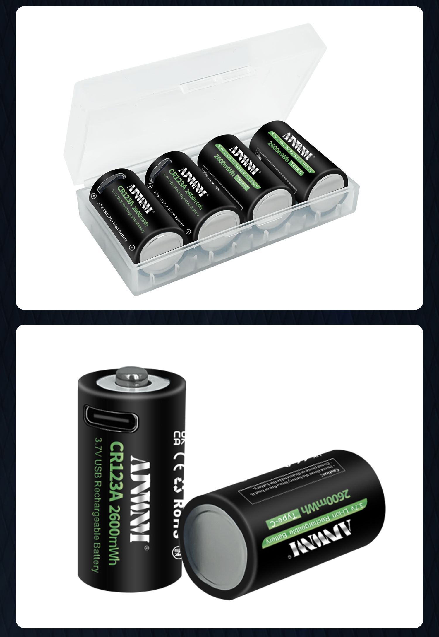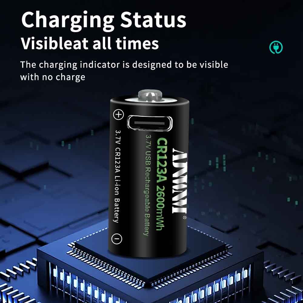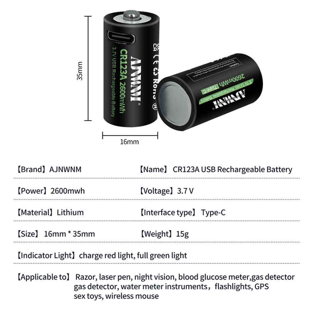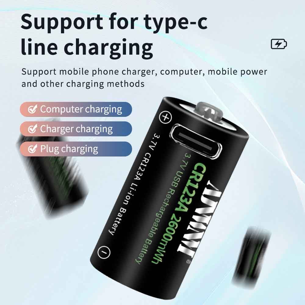 2600mWh Батарейка AJNWNM CR123A / CR123 / RCR123 USB Lithium 3.7V 4шт +кейс и кабель type-c USB для батареек