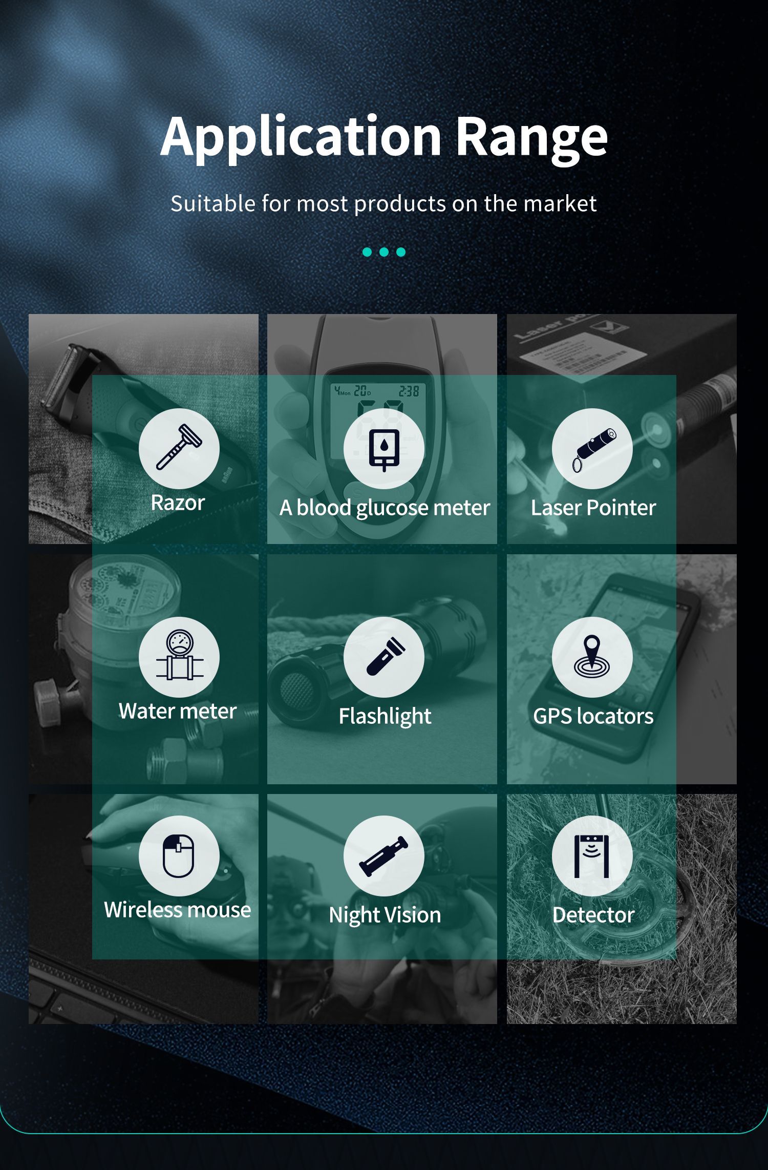 Применимо к: бритвам, лазерным указкам, приборам ночного видения, измерителям уровня глюкозы в крови, детекторам газа, детекторам газа, счетчикам воды, фонарикам, GPS-локаторам, секс-игрушкам, беспроводным мышам,