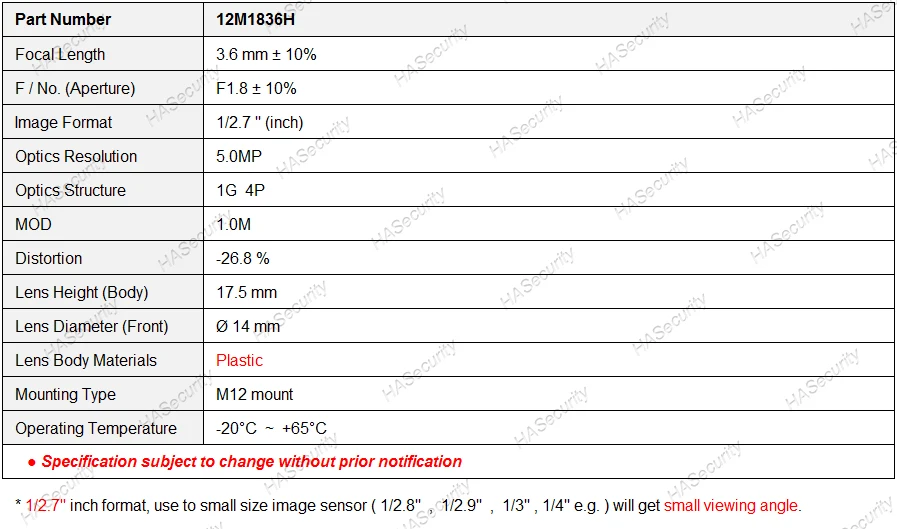 3,6 мм, 5MP , 1/2.7 "формат F1.8 диафрагма M12 крепление объектива + IRCut