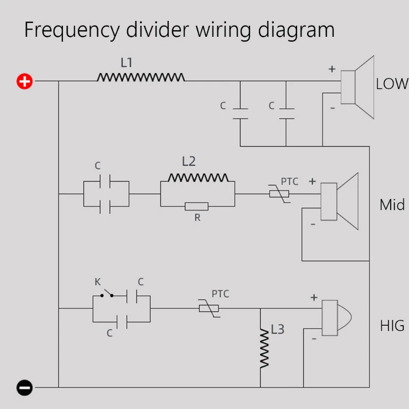 2,10 микрофарадный фильтр среднего диапазона:Динамики фильтруют делитель частоты, в котором используется фильтр среднего диапазона на 10 микрофарад для фильтрации низкочастотных и высокочастотных звуков, что делает его совместимым с динамиками среднего диапазона размером от 3 до 6,5 дюймов, в то время как большая индуктивность в низкочастотной цепи ограничивает прохождение высокочастотных звуков.