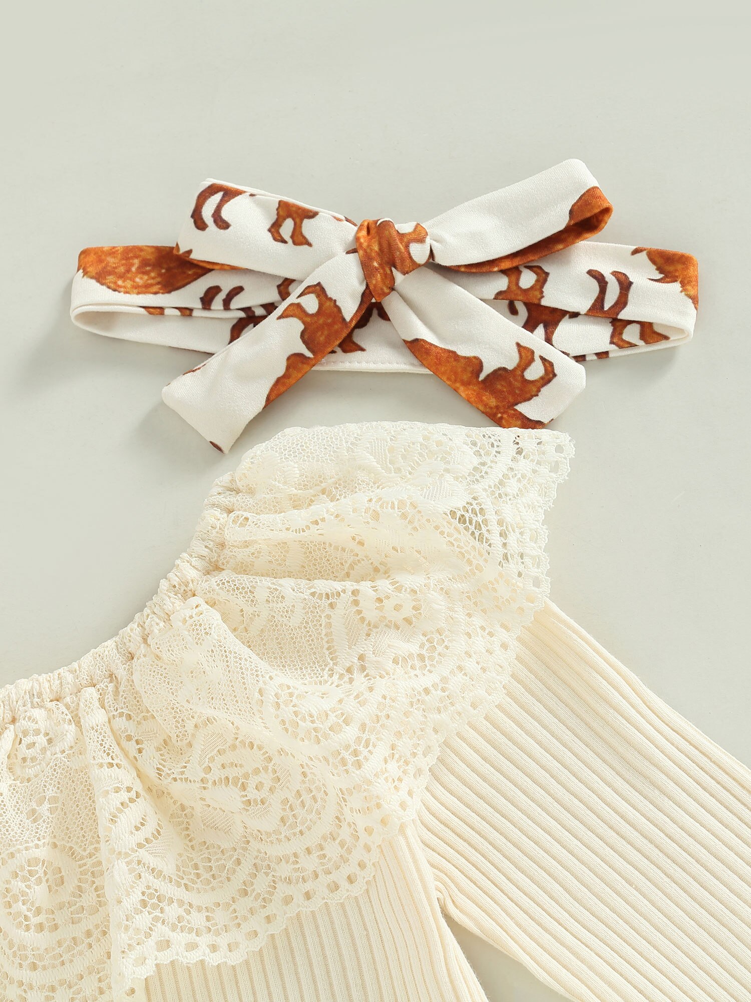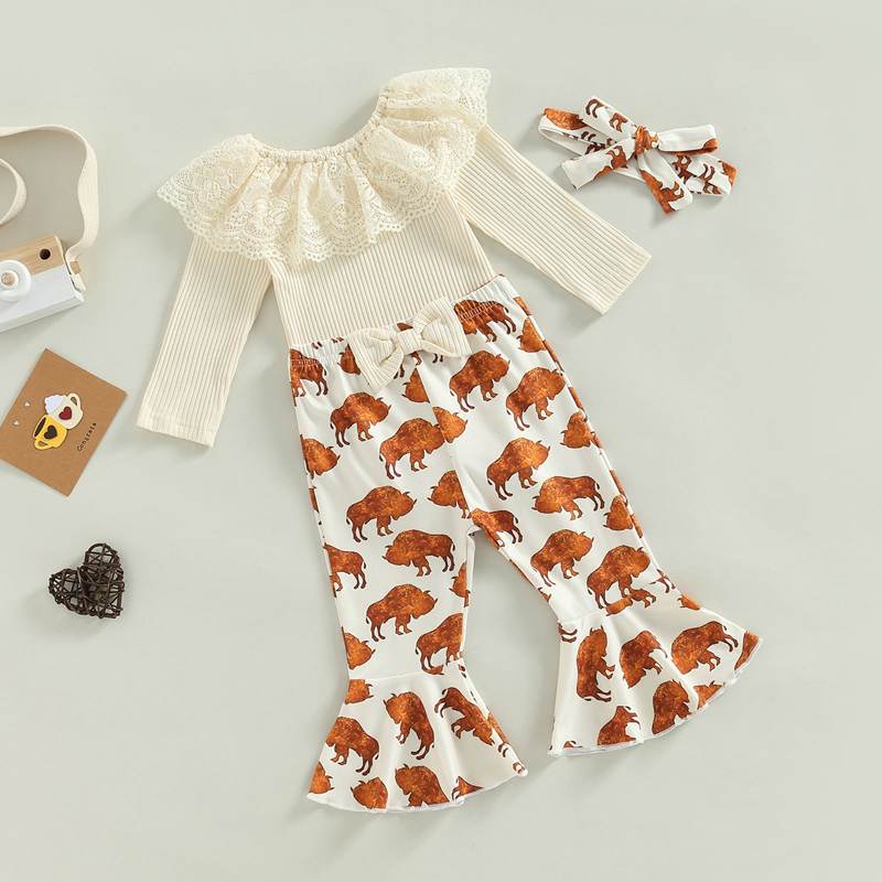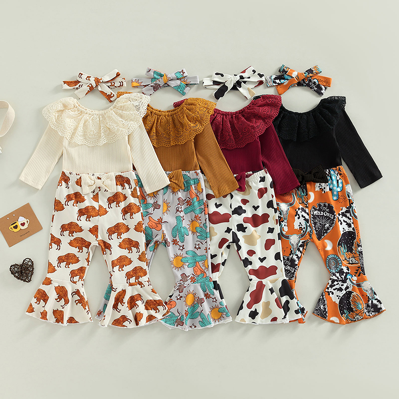 Описание: Детский костюм со штанами для девочек, однотонные топы с длинными рукавами и круглым вырезом, длинные штаны-колокольчики, повязка на голову