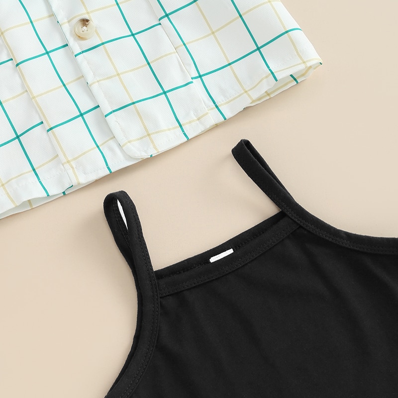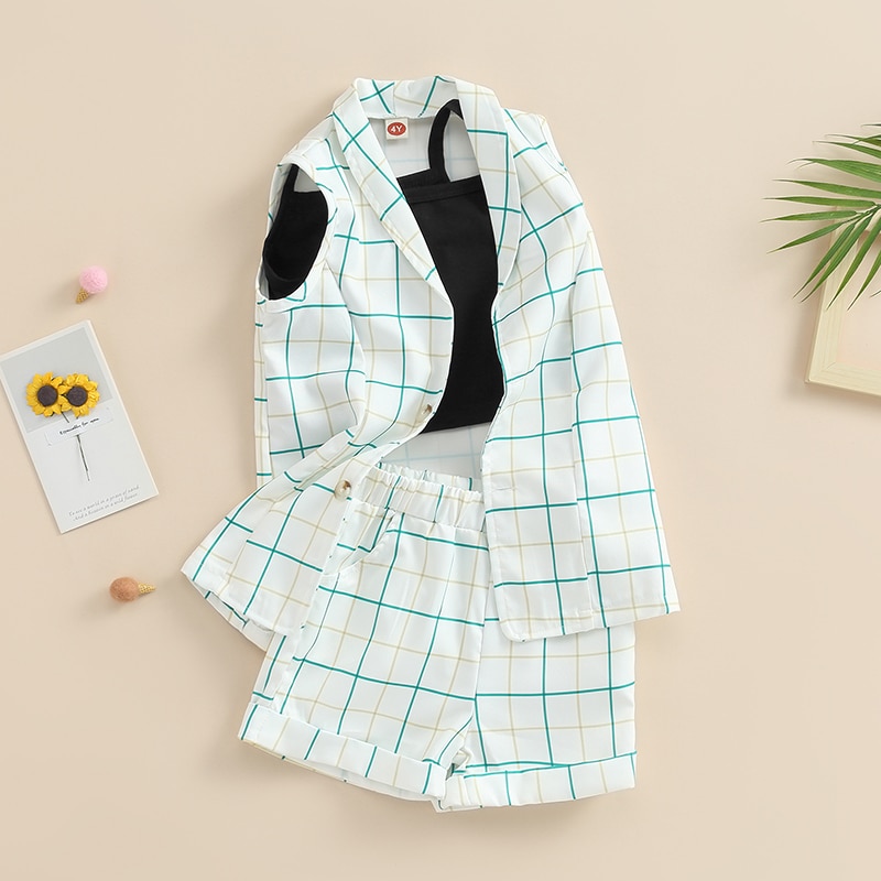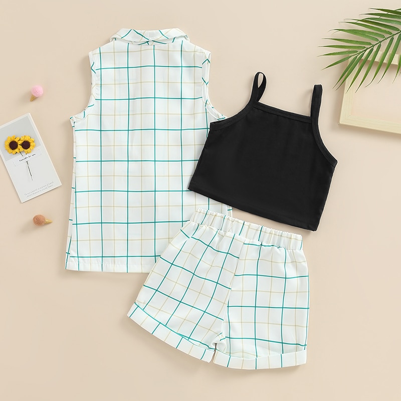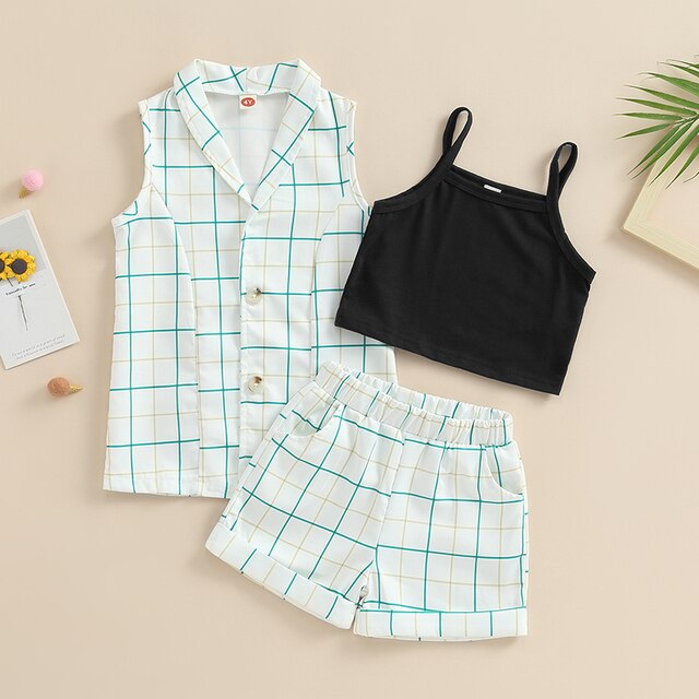 Детская летняя одежда для девочек, майки, клетчатый жилет с отложным воротником, эластичные шорты на талии, комплект детской одежды из 3 предметов