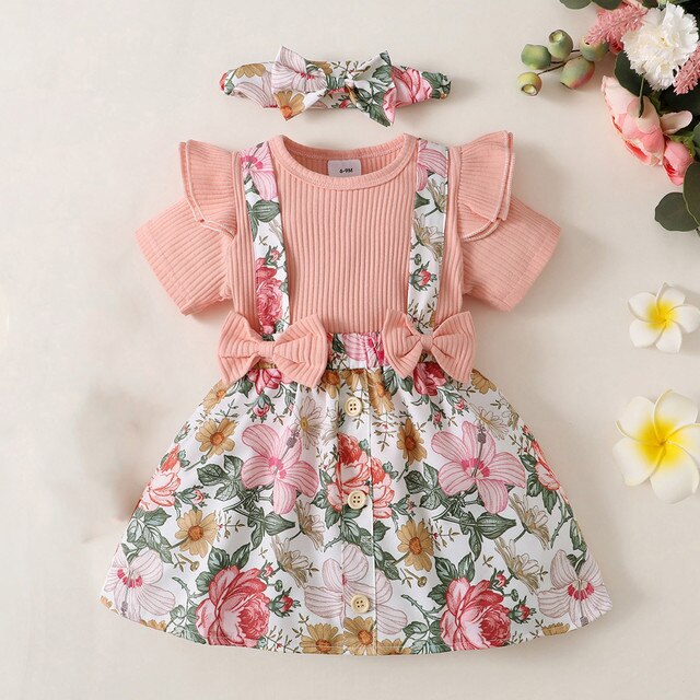 Малыш девочек с коротким рукавом Цветочные печати топы жилет платье повязки 3 шт повседневный костюм наряды