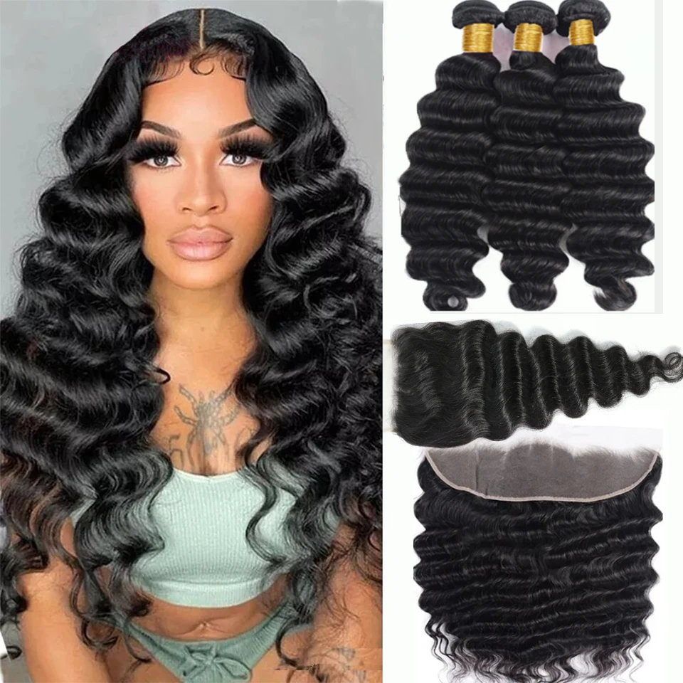 30 32 34 40 длинные недорогие пучки свободных глубоких волн с застежкой фронтальные перуанские пряди волос с застежкой Remy 100% человеческие волосы