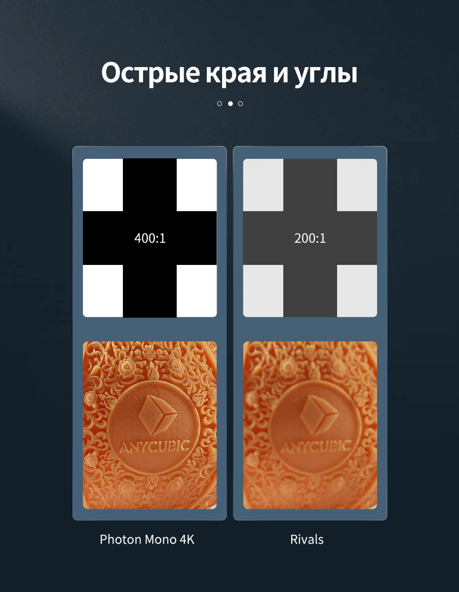 Принятие ведущего в отрасли экрана с коэффициентом контрастности 400:1, на 100% выше, чем AnyCubic Photon, Photon Mono и его противовесов 200:1, anyCubic Photon Mono 4K обеспечивает ваши 3D модели с очень острыми и прозрачными краями и углами.
