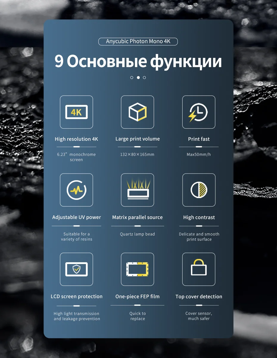 С разрешением 3840x2400 px, экран AnyCubic Photon Mono 4K's имеет общее количество более 9.2 миллиона пикселей, что на 122% выше, чем AnyCubic Photon, Photon Mono и его противовес 2K разрешение экрана. Высокое разрешение приносит яркие детали для ваших 3D моделей.