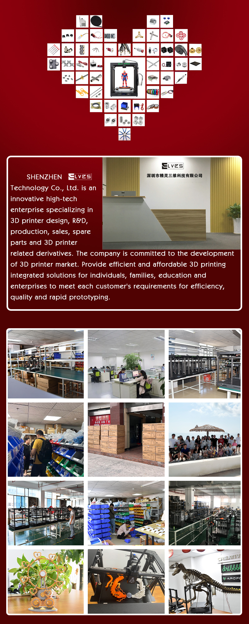 Elves-инновационное высокотехнологичное предприятие, специализирующееся на проектировании 3D-принтеров, исследованиях и разработках, производстве, продаже, запасных частях и производных 3D-принтеров. Компания стремится к развитию и инновациям рынка 3D-принтеров для отдельных лиц, семей, образования. Компания предоставляет эффективное и доступное решение для 3D-печати, отвечающее требованиям каждого клиента к эффективности, качество и быстрое прототипирование.