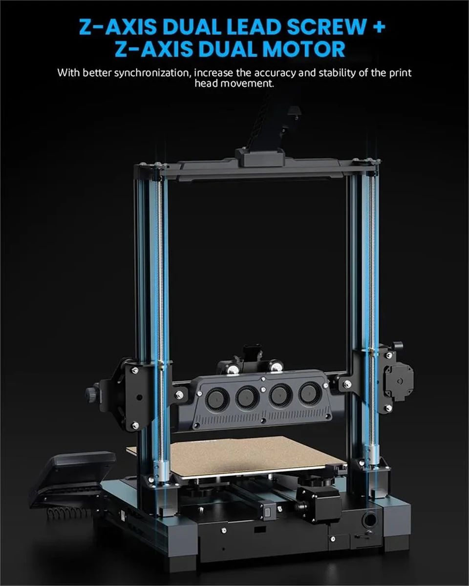 Двойной ходовой винт по оси Z + двойной двигатель по оси Z обеспечивает лучшую синхронизацию, повышая точность и стабильность движения печатающей головки.