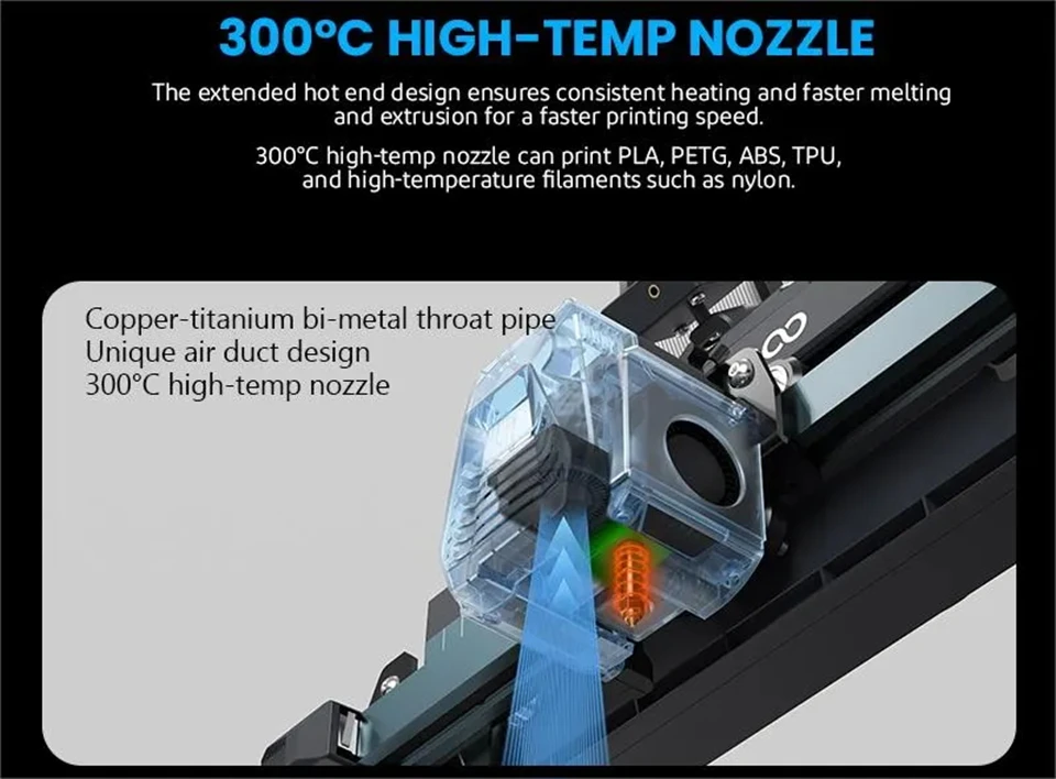 【Высокотемпературное сопло 300 ° C】 С высокотемпературным соплом 300 ° C и удлиненным горячим концом, что означает, что нить может полностью расплавляться и равномерно вытекать даже при высокой скорости печати, этот принтер может обрабатывать широкий спектр материалов, включая PLA, PETG, ABS, TPU и высокотемпературные нити, такие как нейлон.