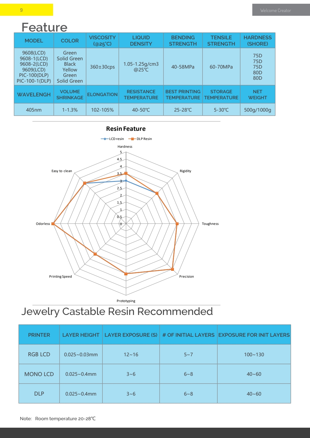 Lcd-9609 желтый (твердость по берегу: 75D), lcd-9608 зеленый (твердость по берегу: 75D), ЖК/dlp-105 желтый (твердость по берегу: 80D), dlp-pic100 желтый (твердость по берегу: 75D)