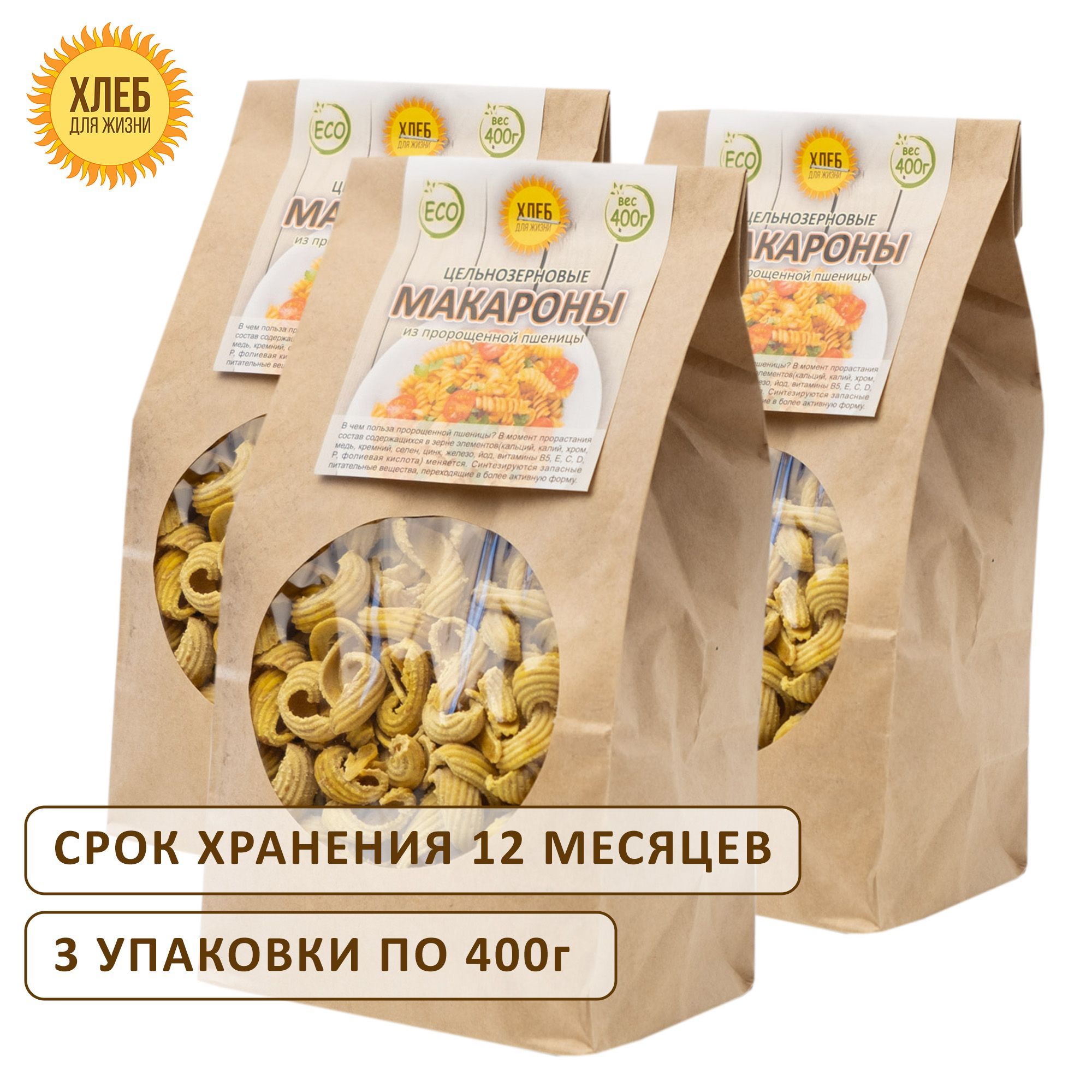 (3х400гр ) Макароны цельнозерновые из пророщенной пшеницы - Хлеб для Жизни