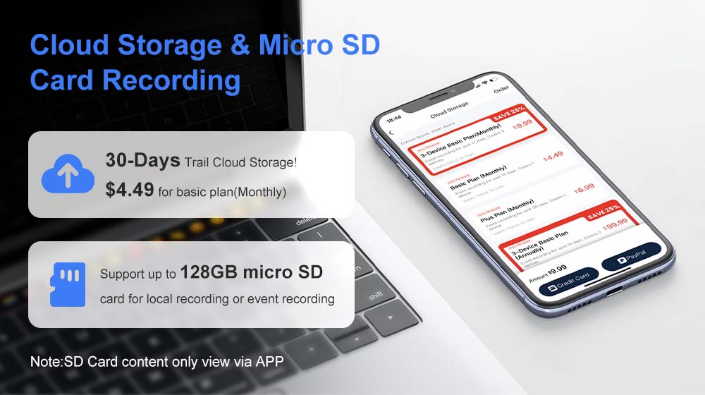 Он может начать запись на карту micro SD (не входит в комплект) или Платное Облачное хранилище после обнаружения движения.