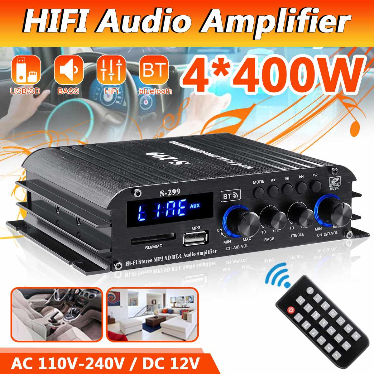 4*400 Вт 4,1 канальный Hi-Fi bluetooth усилитель мощности для автомобиля/домашнего кинотеатра, цифровой усилитель мощности звука для динамика, басов, USB/SD AUX